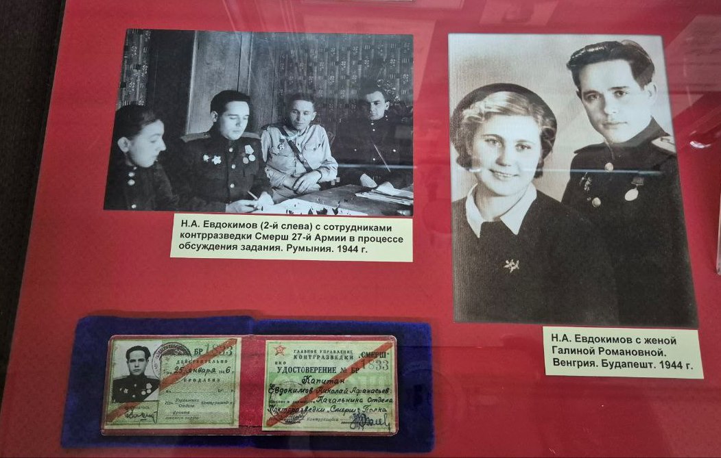 Особое место на выставке занимают документы, фотографии и воспоминания ветерана Управления УФСБ России по Белгородской области Николая Афанасьевича Евдокимова.