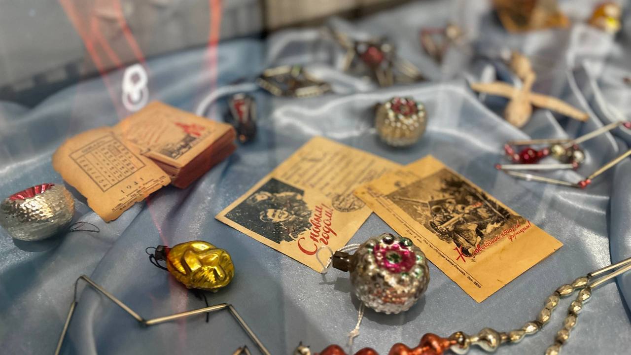 В витринах собраны поздравительные открытки, ёлочные игрушки и украшения, по которым можно проследить историю нашей страны.