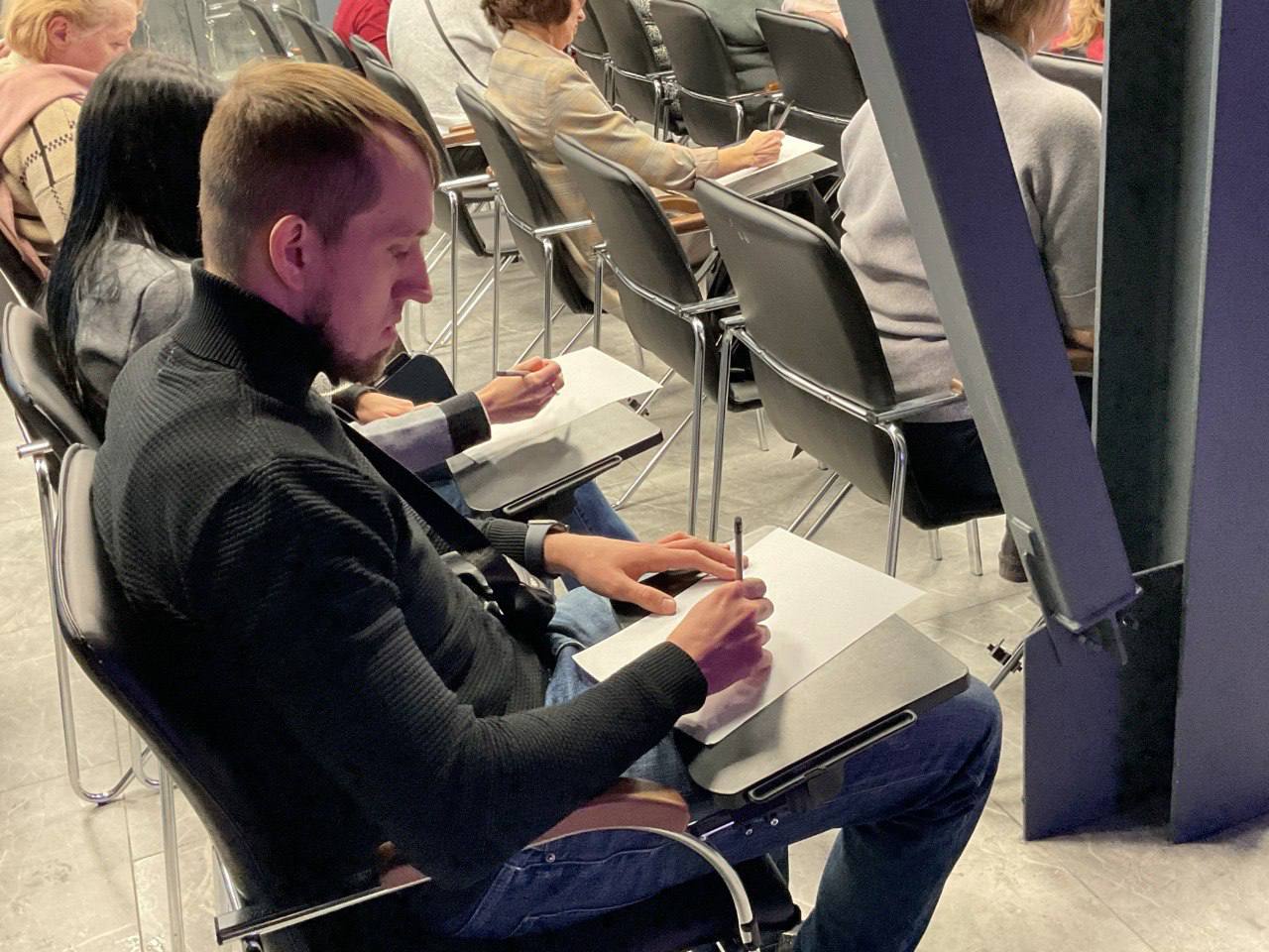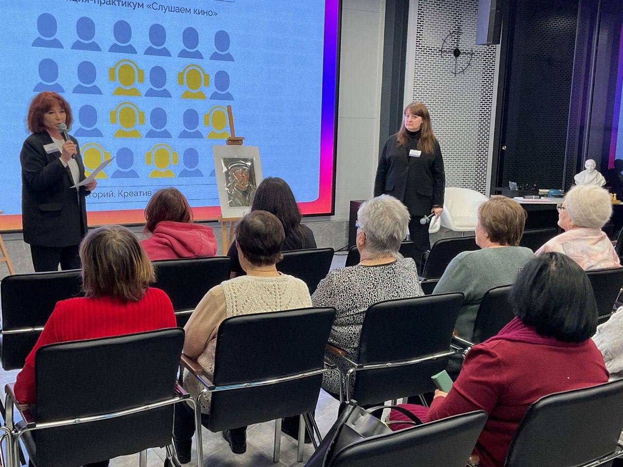 Затем состоялась лекция-практикум «Слушаем кино». Участники узнали, как работает тифлокомментирование, посмотрели фрагмент фильма с описанием и даже попробовали себя в роли профессионального тифлокомментатора и создали свой собственный тифлокомментарий.