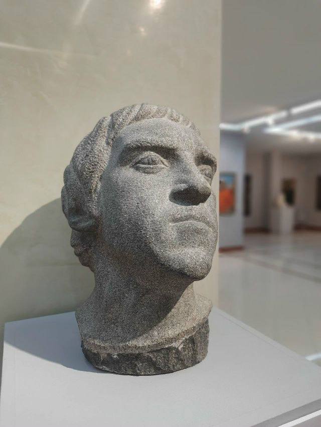 Представленный в зале гранитный образ — не портрет в привычном смысле. Скульптор выбрал этот твёрдый материал неслучайно — он под стать характеру автора.