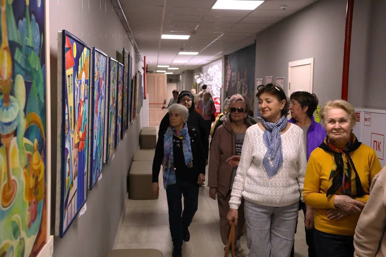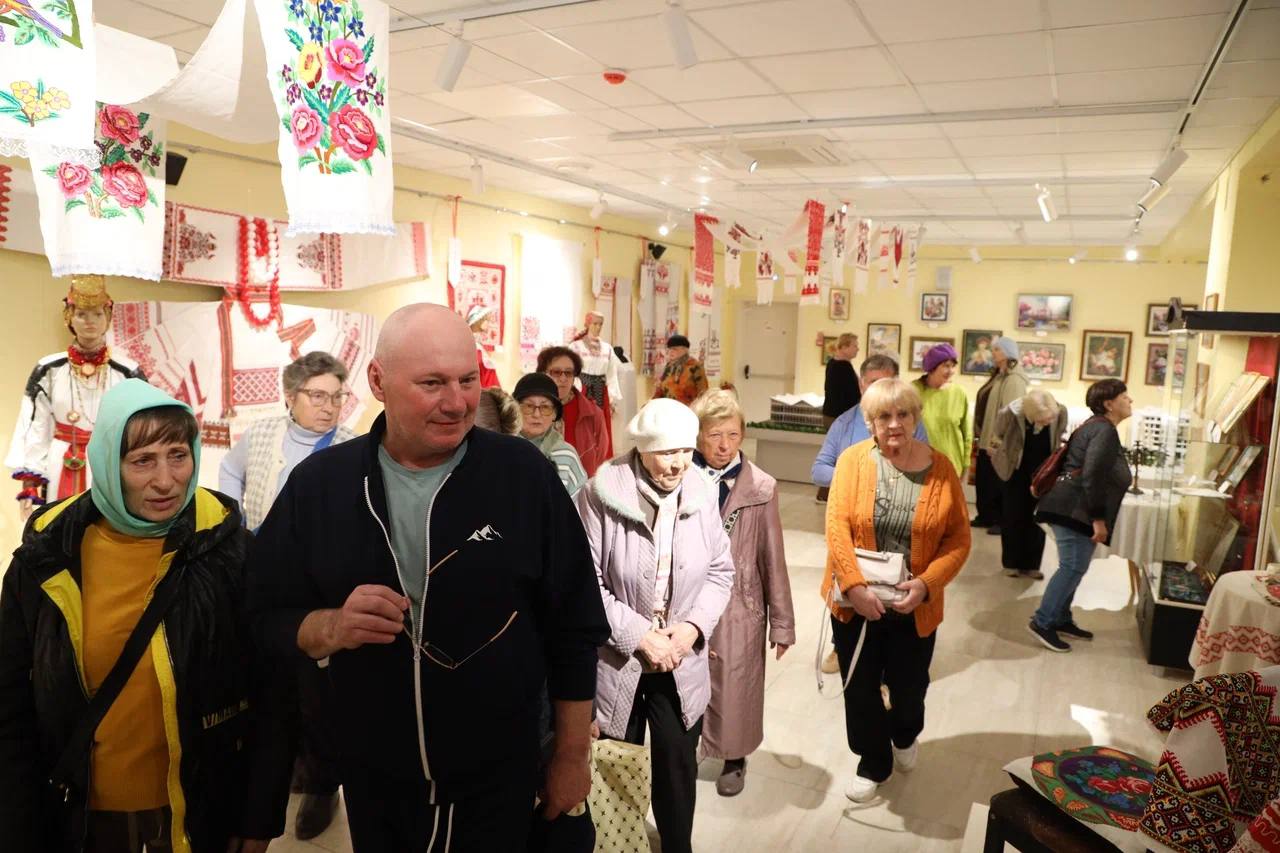 Сначала гости побывали в большом зале, затем отправились знакомиться с выставками: «В царстве красочных фантазий» и «Вышитое счастье» .