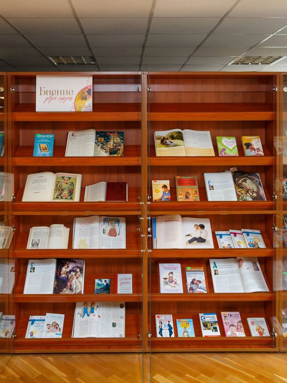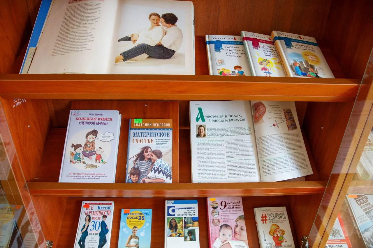 Экспозиция разместилась на двух тематических стеллажах. Первый посвящен православному празднику Благовещения. Здесь представлены духовная литература, иконография и материалы о значении этого дня в православной традиции. Второй стеллаж объединил разнообразную литературу для будущих и настоящих родителей: книги о духовной подготовке к родительству, медицинские справочники по ведению беременности, практические пособия по уходу за младенцами, а также вдохновляющие истории из жизни семей.