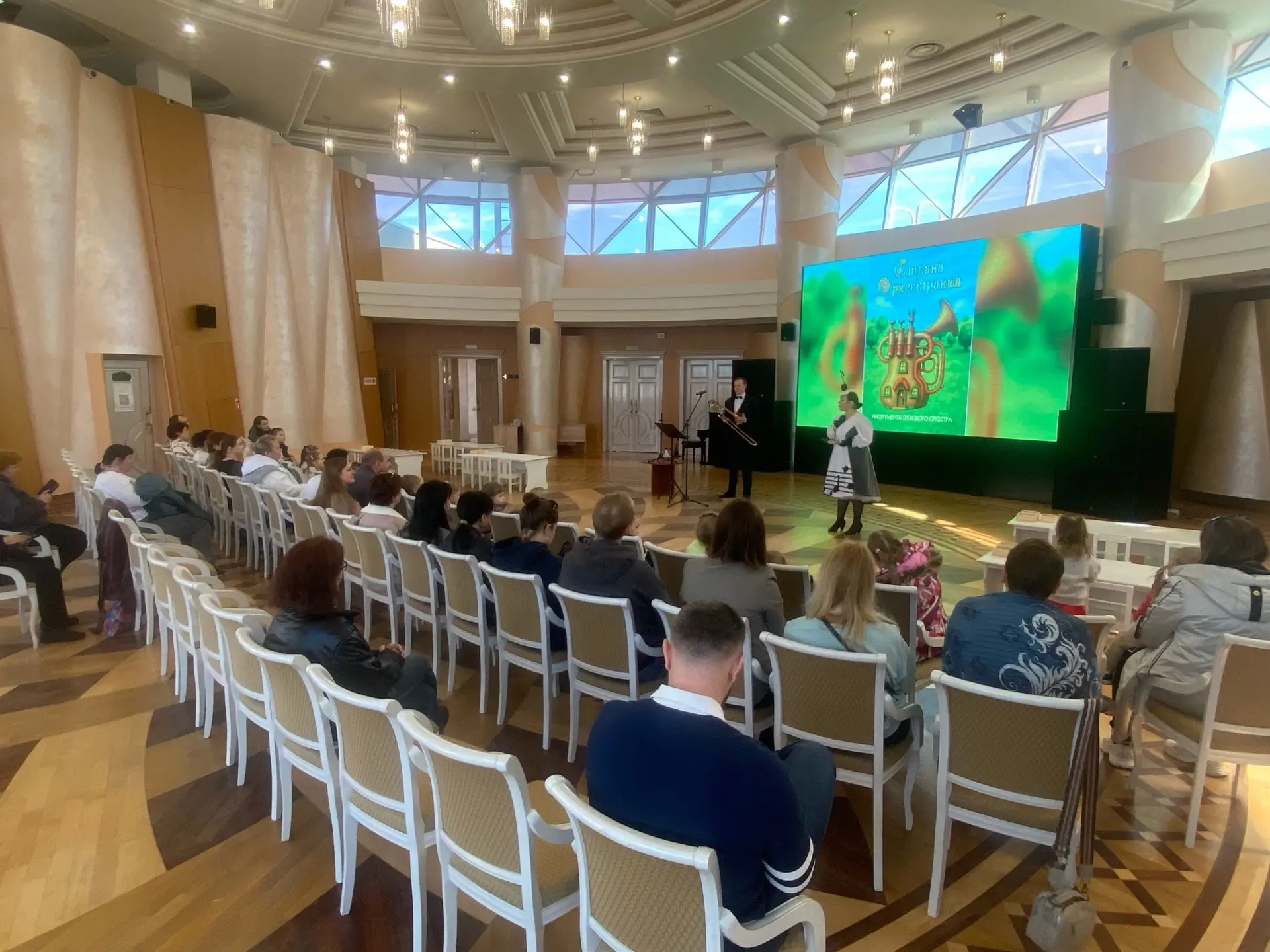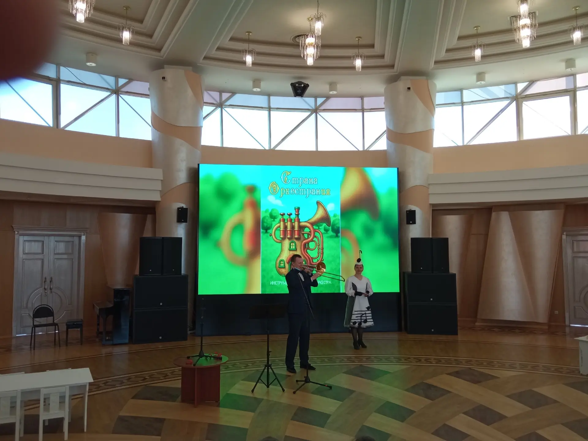 Ведущая детской музыкально-познавательной программы Нотка (Вера Цукаленко) рассказывала ребятам про тромбон. А представил этот музыкальный инструмент артист и дирижёр Концертного оркестра духовых инструментов Дмитрий Артёмов.