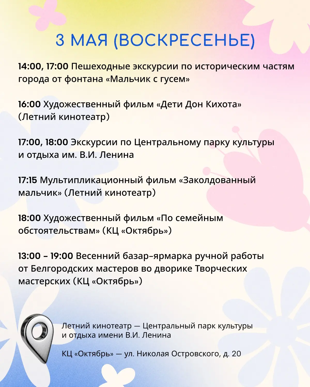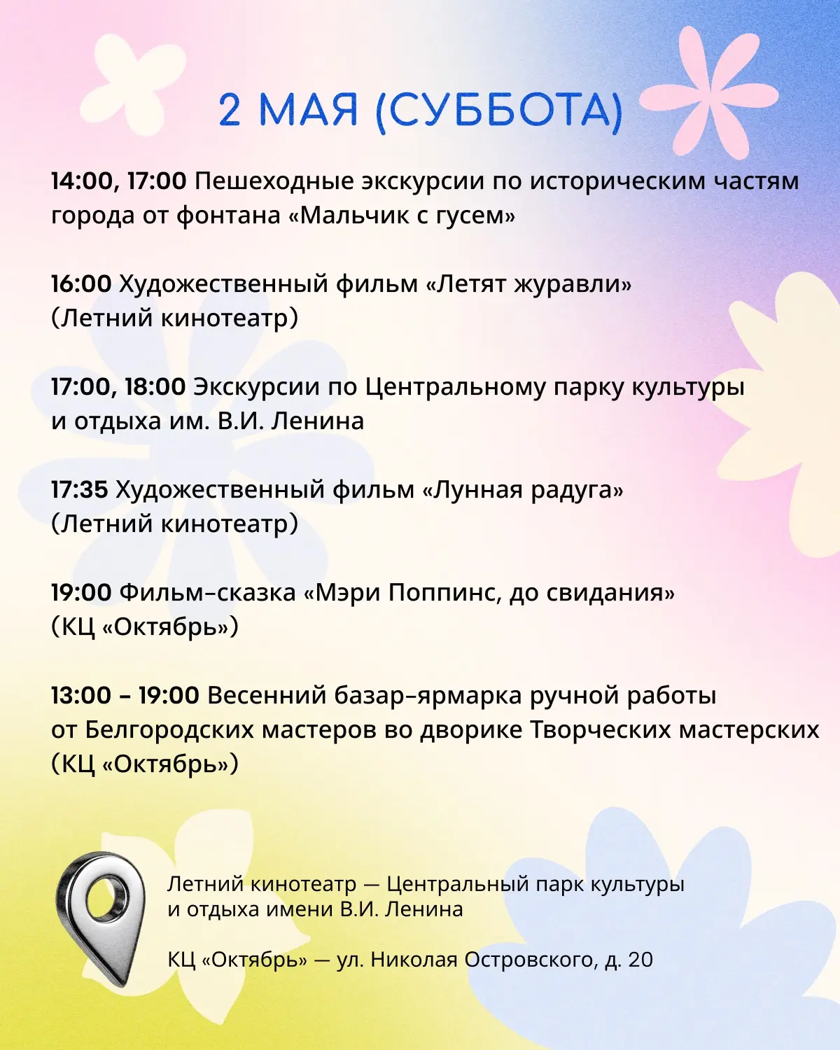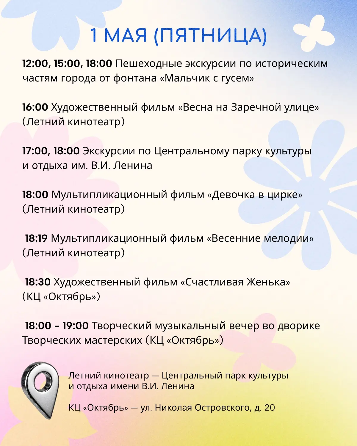 В Центральном парке культуры и отдыха имени В.И. Ленина на кинопоказах, экскурсиях, музыкальном вечере и на ярмарке ручной работы.