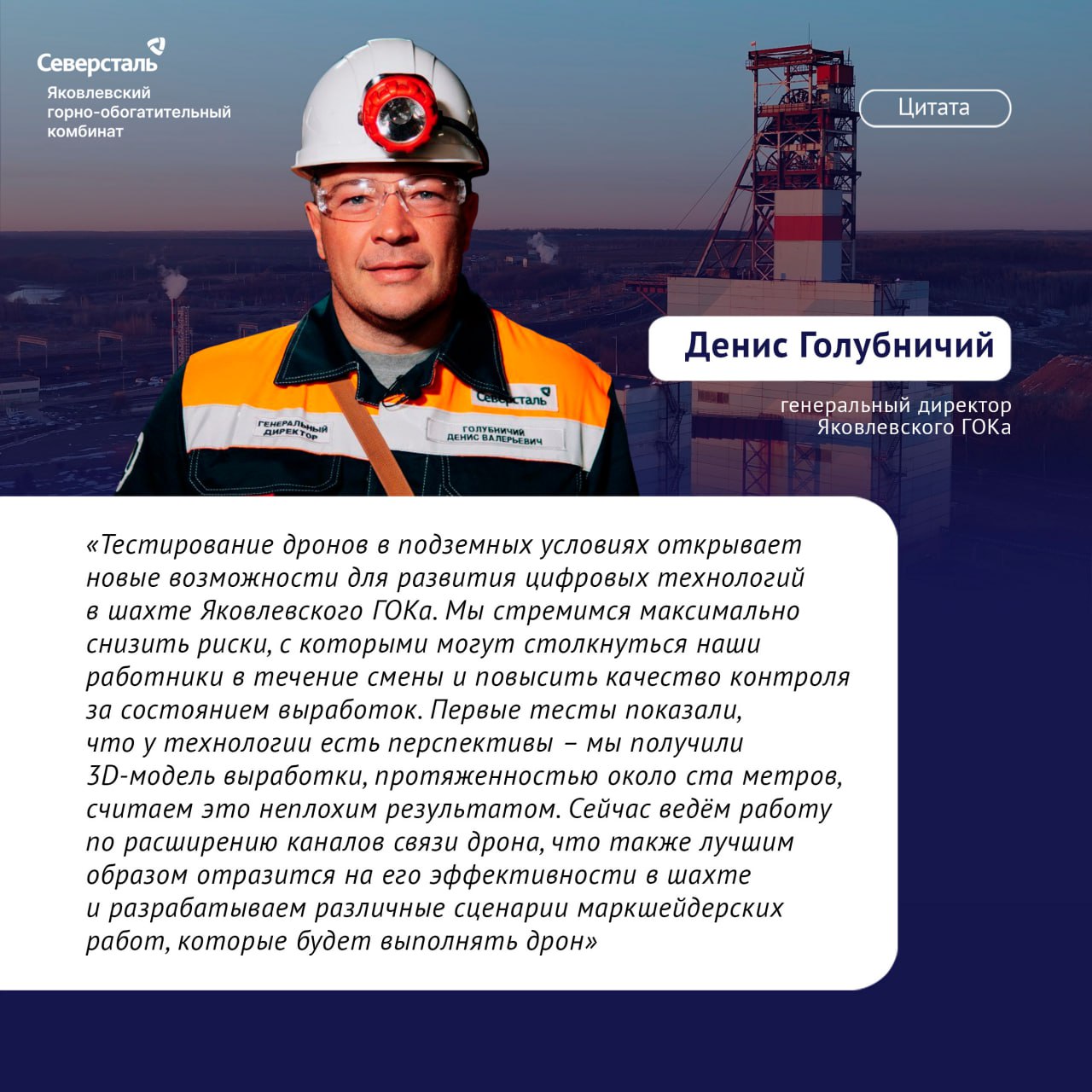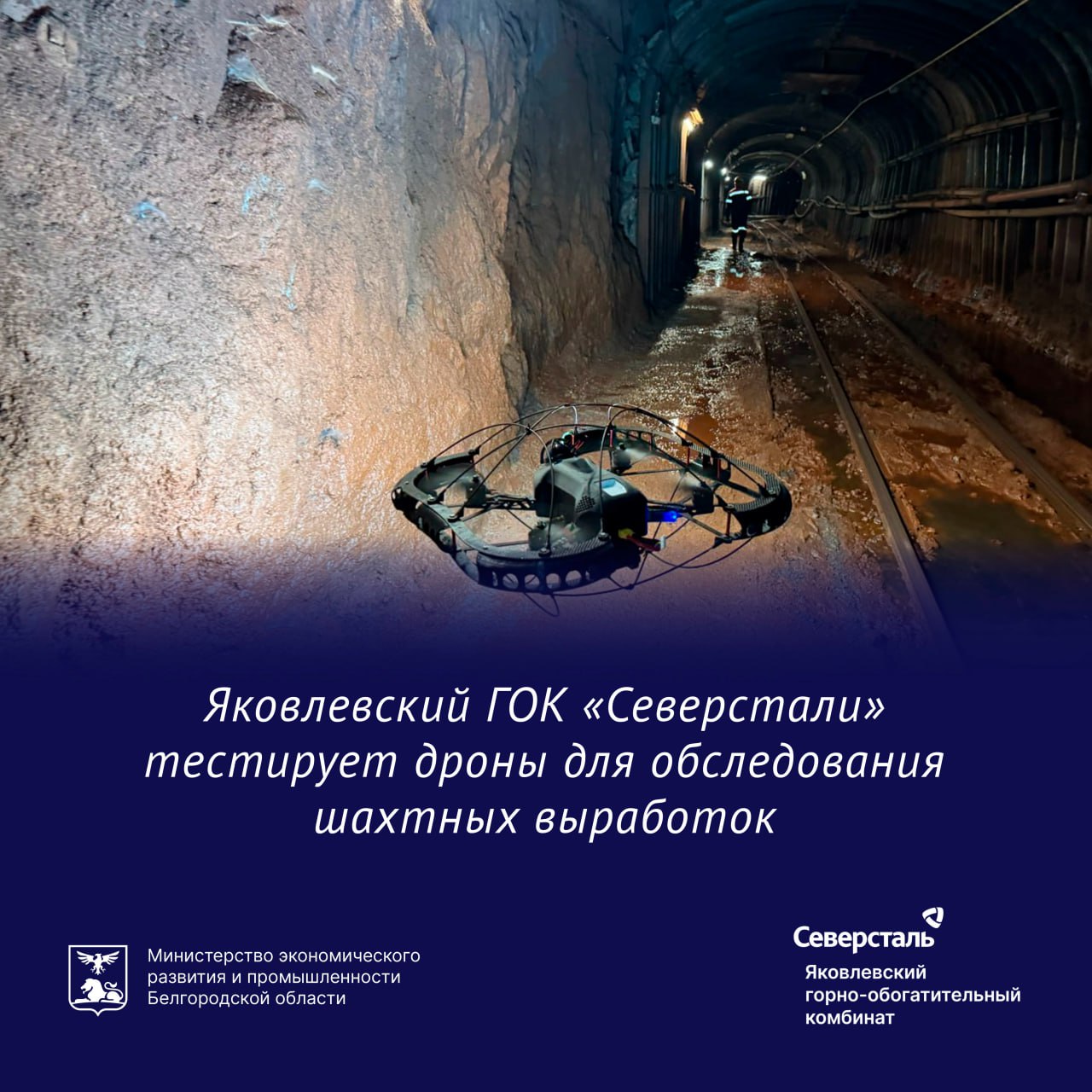 Яковлевский ГОК продолжает цифровую трансформацию для повышения безопасности, производительности и устойчивого развития производства. Успешно проведены испытания дрона для создания 3D-моделей горных выработок и труднодоступных зон шахты.