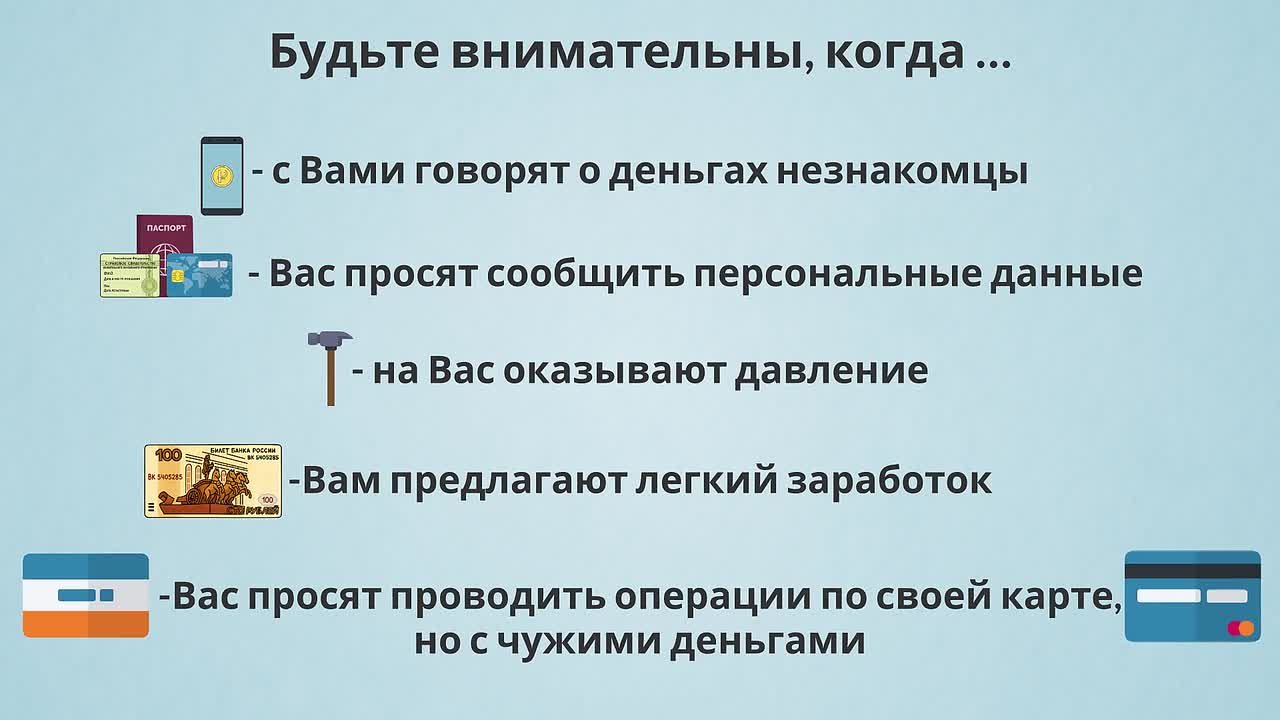 В рамках деятельности по повышению уровня финансовой грамотности граждан Российской Федерации по заказу Минфина России федеральным методическим центром финансовой грамотности РЭУ им. Г.В. Плеханова разработаны анимированные видеоролики по финансовой грамотности, раскрывающие тематику защиты от телефонного мошенничества и других рисков потери денег, а также карточки, информирующие об основных мошеннических схемах.