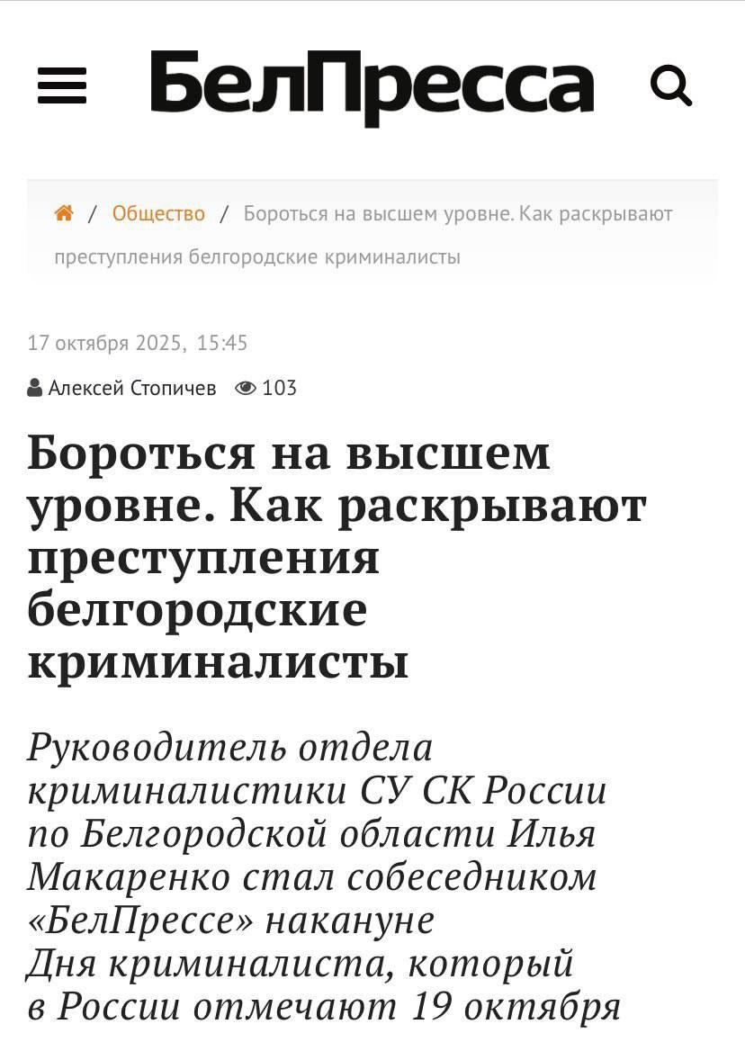 Интервью руководителя отдела криминалистики СУ СК России по Белгородской области И.В. Макаренко ко Дню криминалистики