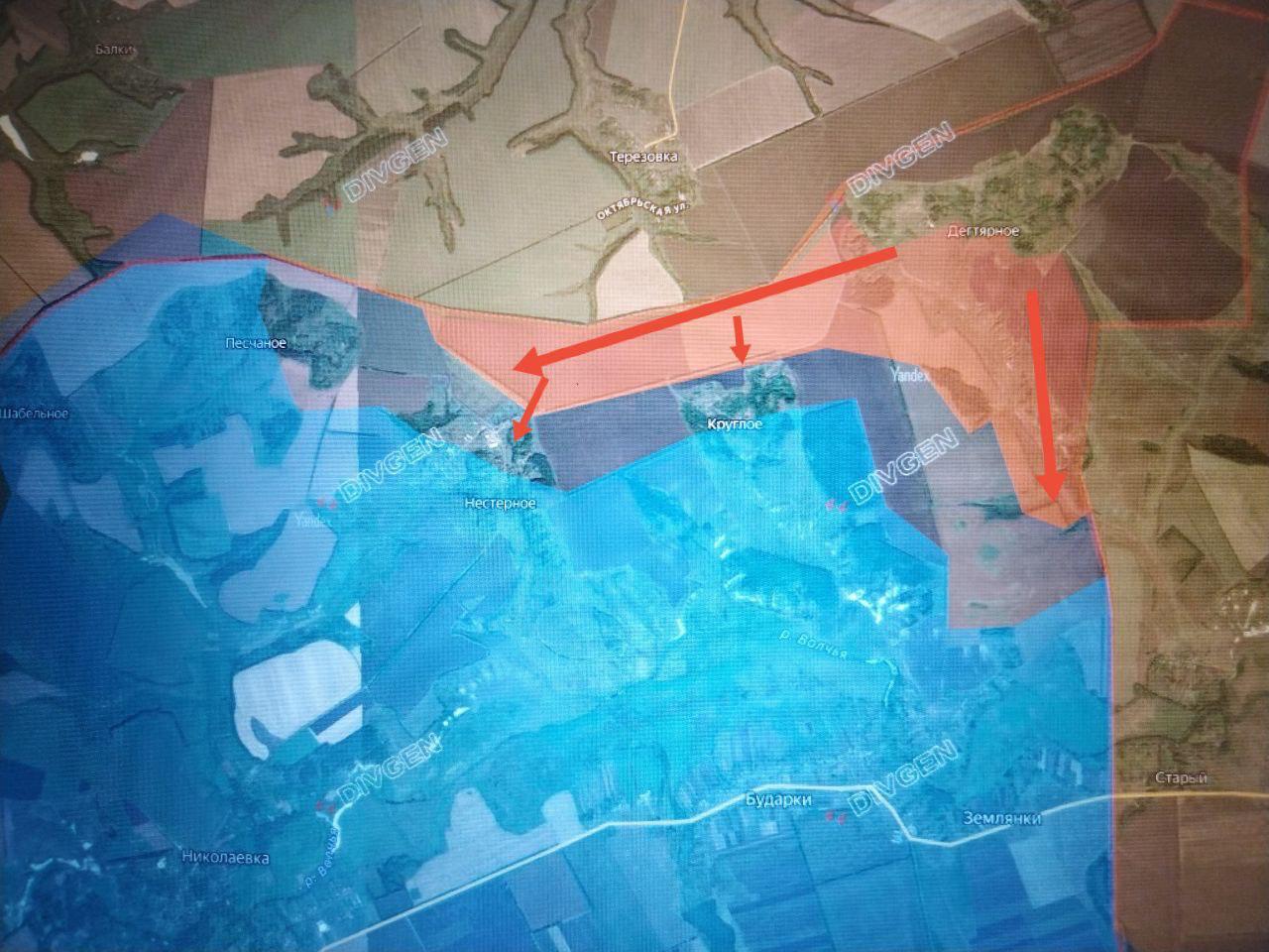 Восточнее 25 км, в районе Дегтярного, наши ВС РФ продвинулись по высотам и вышли к Нестерному и Крутому, а также южнее Дегтярного до 3 км в направлении с. Землянки.