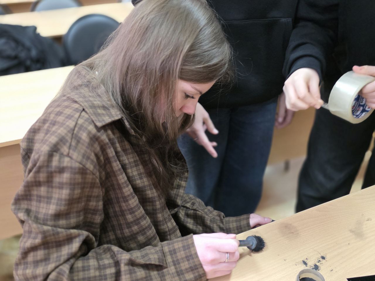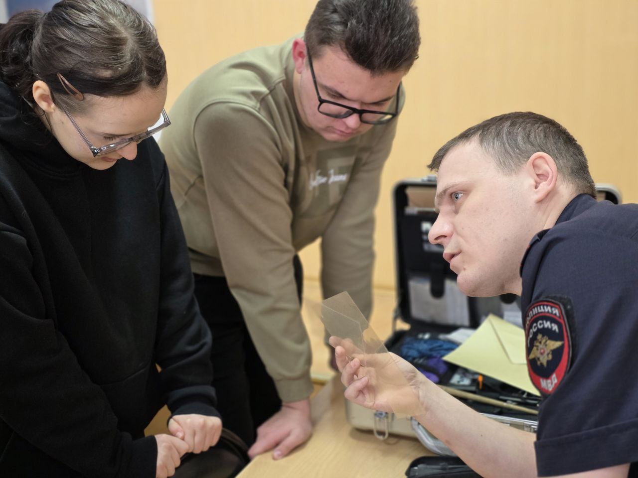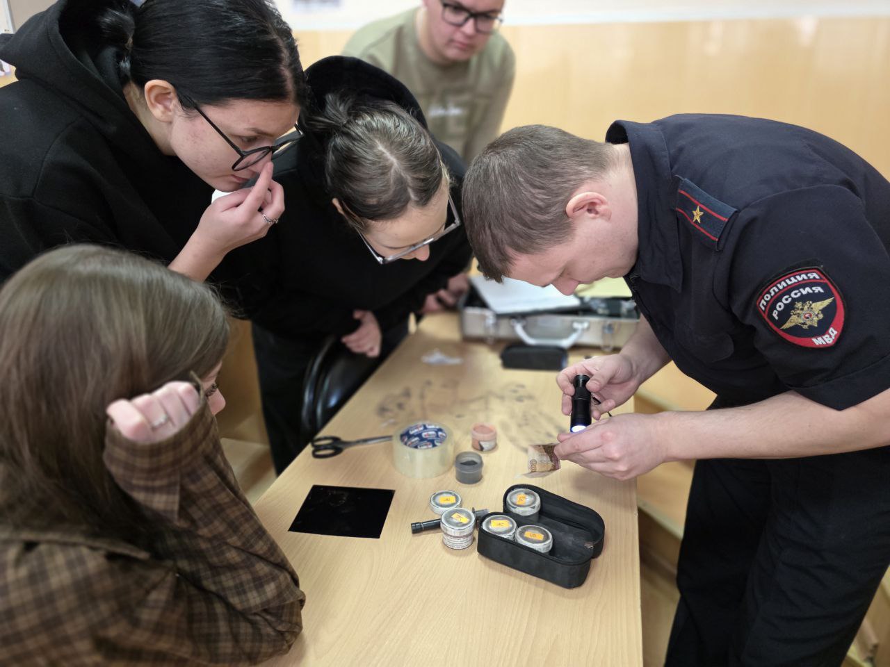 Неподдельный восторг у студентов вызвала встрече с экспертом-криминалистом. Юноши и девушки получили возможность примерить на себя роль настоящих сыщиков. Полицейские продемонстрировали студентам передвижную криминалистическую лабораторию и предложили поучаствовать в процедуре дактилоскопии.