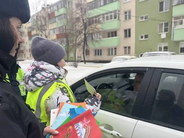 Ребята вручали автомобилистам сделанные своими руками открытки с машинками и армейскими звездами. Дети пожелали жителям и гостям региона безопасных дорог и попросили соблюдать ПДД.