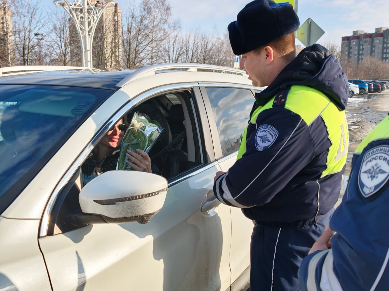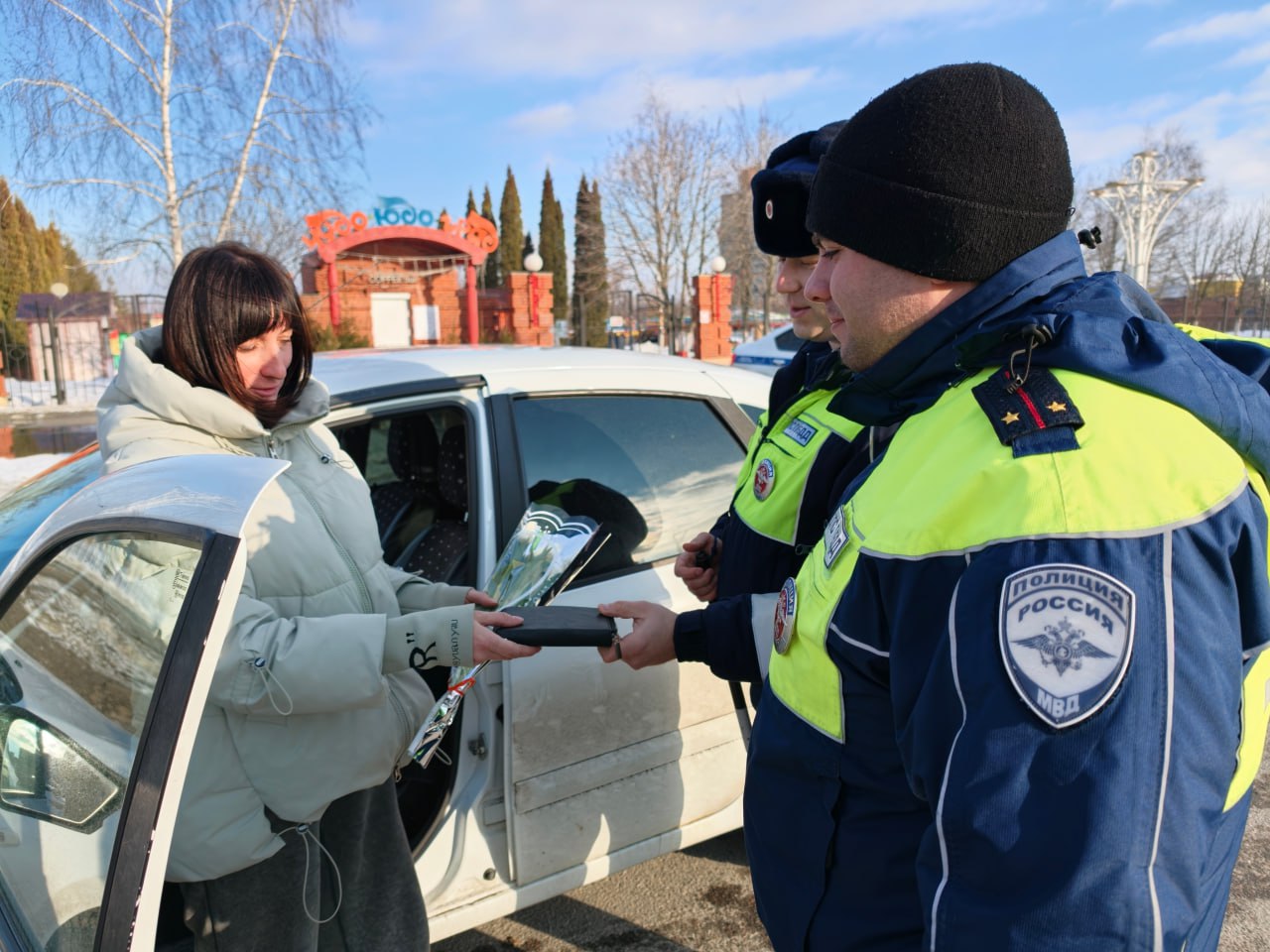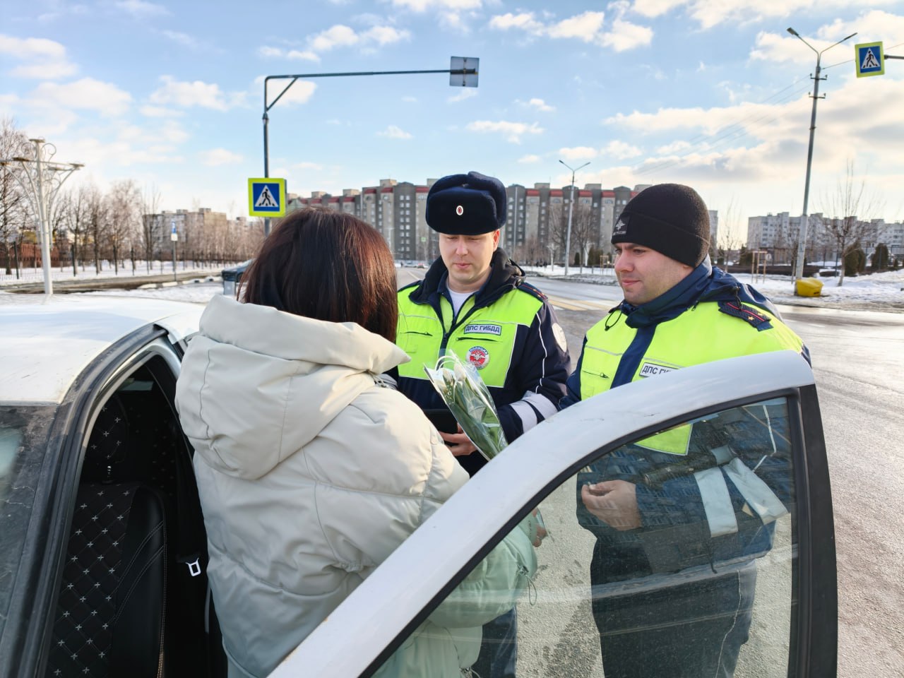 На дорогах города автоинспекторы останавливали автомобили под управлением женщин, но вместо привычной проверки документов дарили им весенние букеты и теплые пожелания. Полицейские поздравляли автоледи с праздником весны, желали безопасных дорог и хорошего настроения.