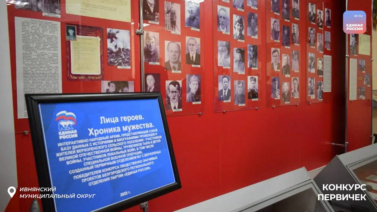 В Ивнянском округе в Верхопенском филиале историко-краеведческого музея открылся интерактивный народный архив «ЛИЦА ГЕРОВ. ХРОНИКА МУЖЕСТВА». Велась большая работа по поиску и систематизации исторической информации. Установленный здесь интерактивный сенсорный экран и информационные роллапы визуализируют идеи проекта, создавая комфортную зону для посетителей.