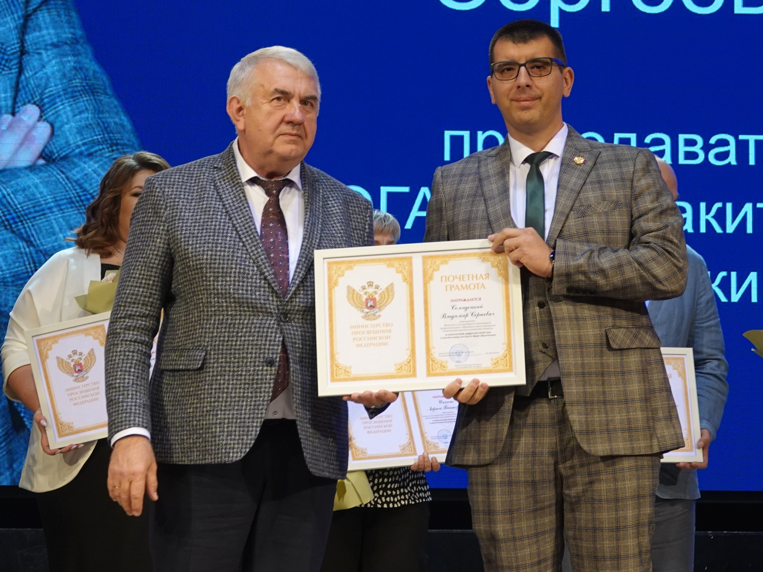 Среди награждённых были и наши земляки. Преподаватель техникума Владимир Семидоцкий удостоен Почётной грамоты Министерства просвещения Российской Федерации за многолетний вклад в воспитание и обучение молодого поколения.