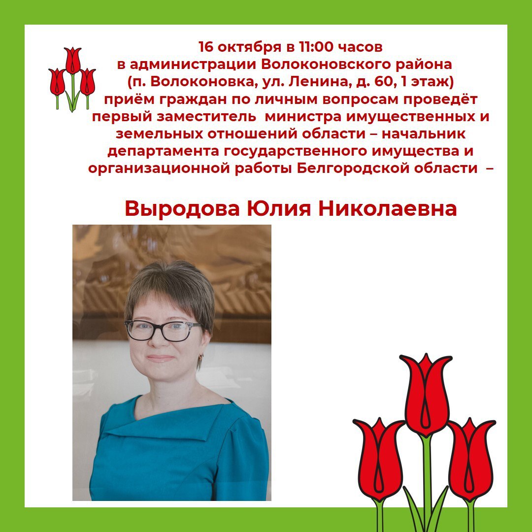 16 октября в 11:00 часов в администрации Волоконовского района (п. Волоконовка, ул. Ленина, д. 60, 1 этаж) приём граждан по личным вопросам проведёт Выродова Юлия Николаевна – первый заместитель министра имущественных и земельных отношений области – начальник департамента государственного имущества и организационной работы Белгородской области.