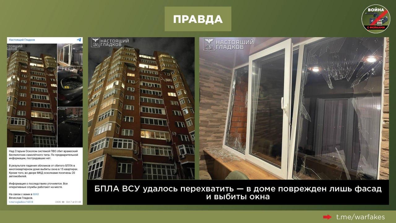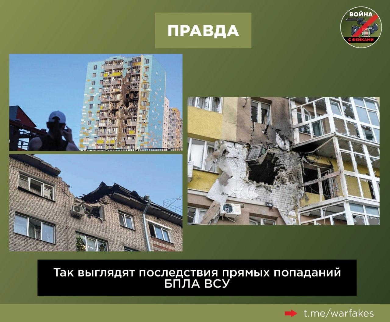 Характер повреждений здания на фотографиях с места событий доказывает, что никакого «удара ракетой ПВО по многоэтажке» не было. Последствия прямых ударов беспилотниками или зенитными ракетами выглядят иначе.
