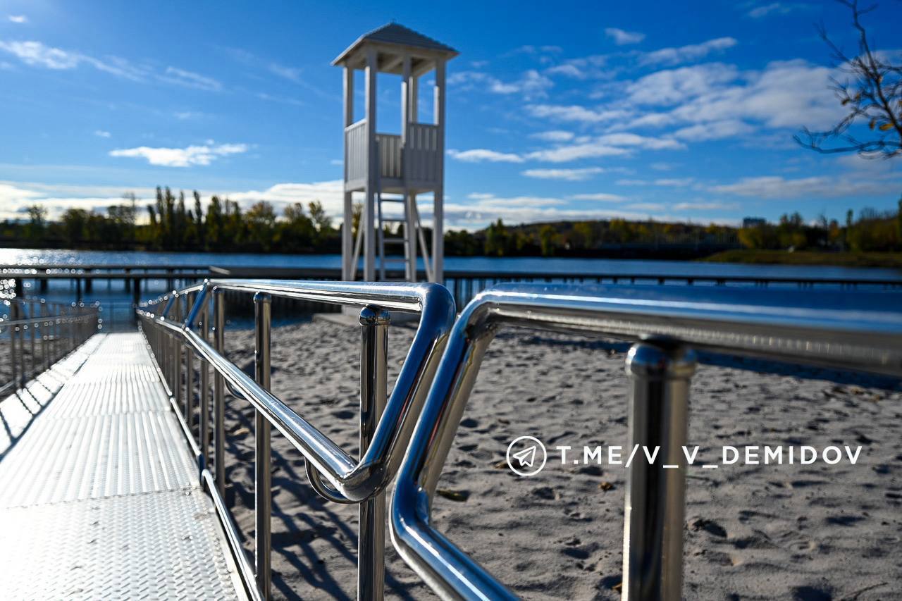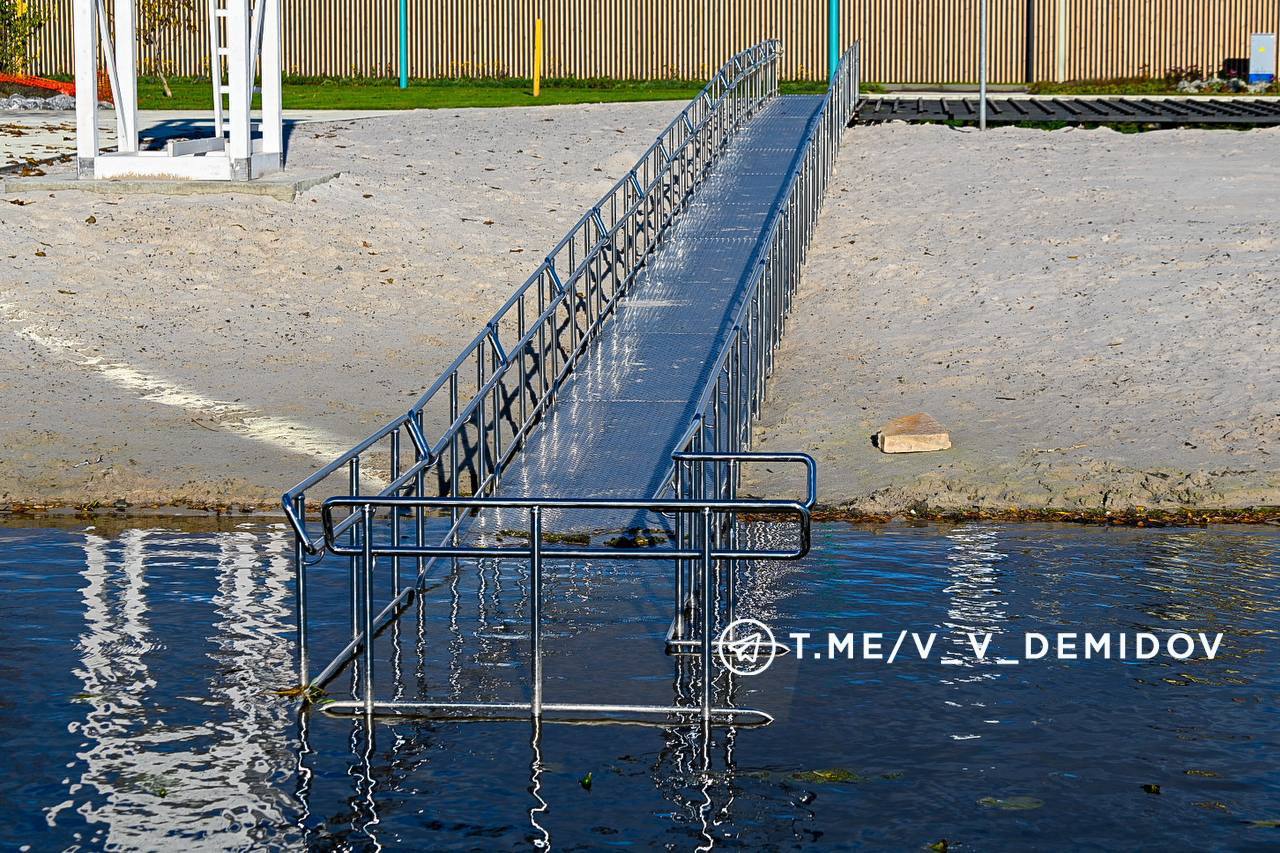 Так, например, на правом берегу центрального пляжа мы построили основание под просторный настил (170 кв.м.), который будет оборудован лежаками, навесом и специальной раздевалкой для маломобильных горожан. Проложили 35-метровый пандус из нержавеющей стали прямо к воде. Он абсолютно безопасен и соответствует всем нормативам. Рядом установим специализированную душевую кабину для максимального удобства.