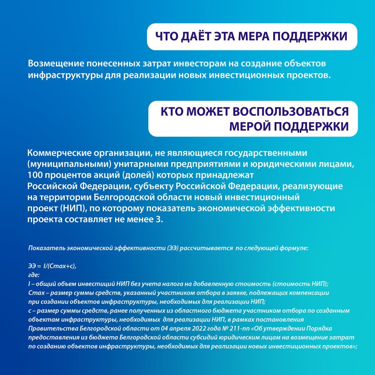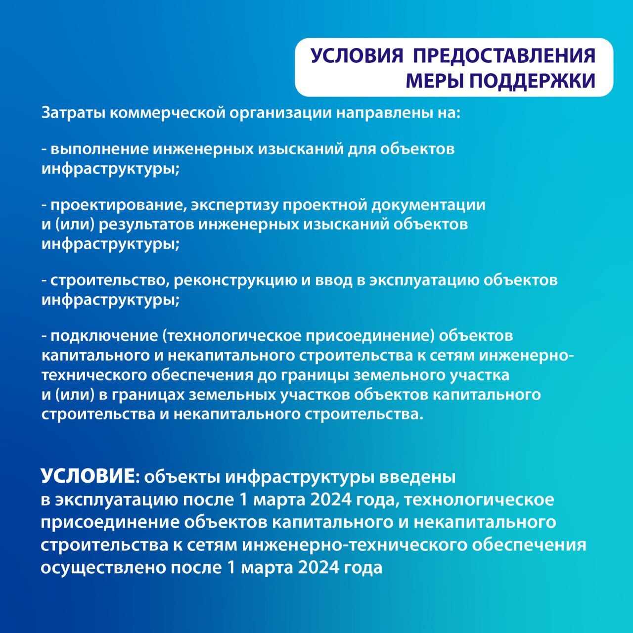 До 17 октября открыт приём заявок на возмещение затрат, связанных с созданием газовых сетей, электро- и водоснабжения, водоотведения, а также дорог на этапе запуска проектов. Это поможет значительно ускорить окупаемость инвестиций и снизить стартовые расходы.