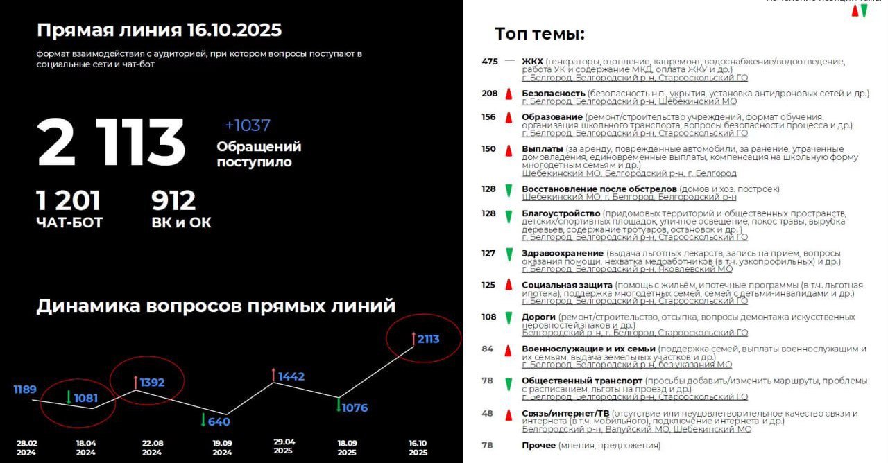 Вячеславу Гладкову жители региона оставили более двух тысяч обращений – вдвое больше, чем месяц назад. Такой рост связали с запуском специального чат-бота для сбора вопросов.