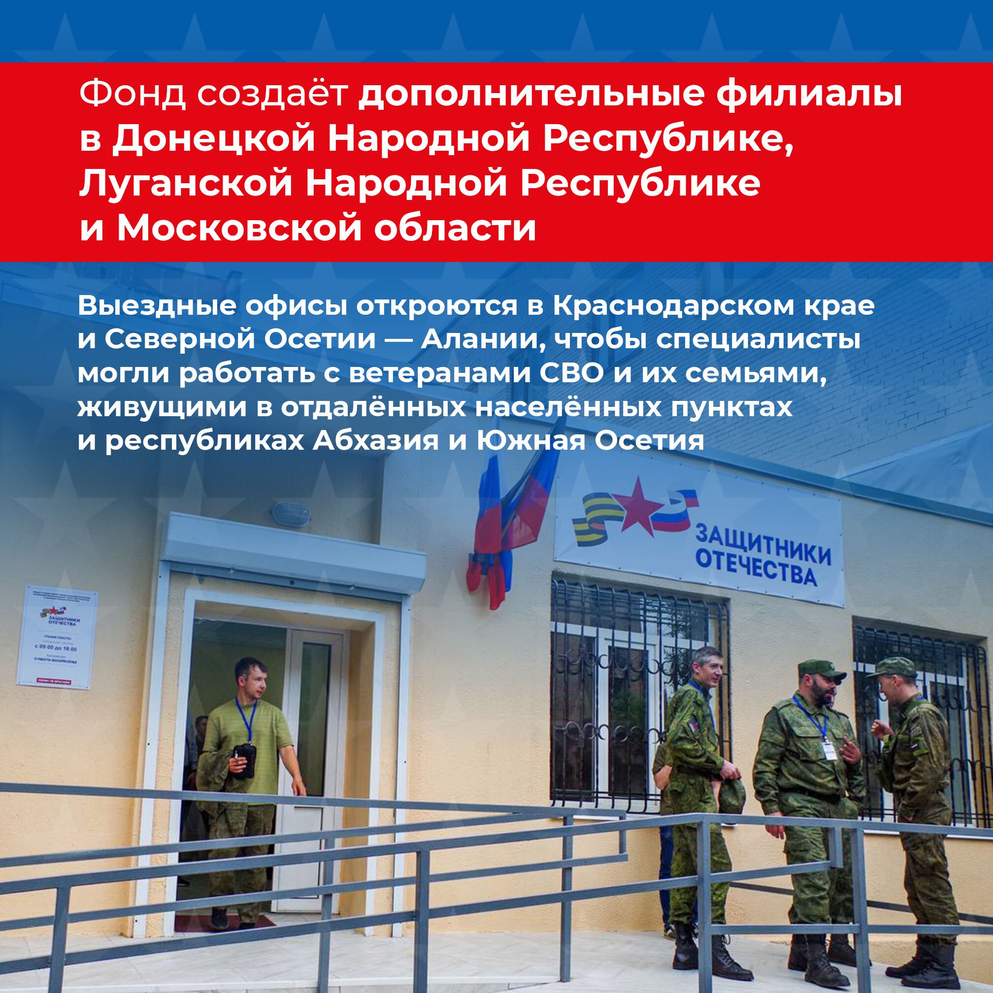 Также осуществляется расширение инфраструктуры региональных представительств фонда путём открытия удаленных отделений и мобильных офисов, позволяющих социальным сотрудникам оперативно взаимодействовать с участниками боевых действий даже в труднодоступных регионах.