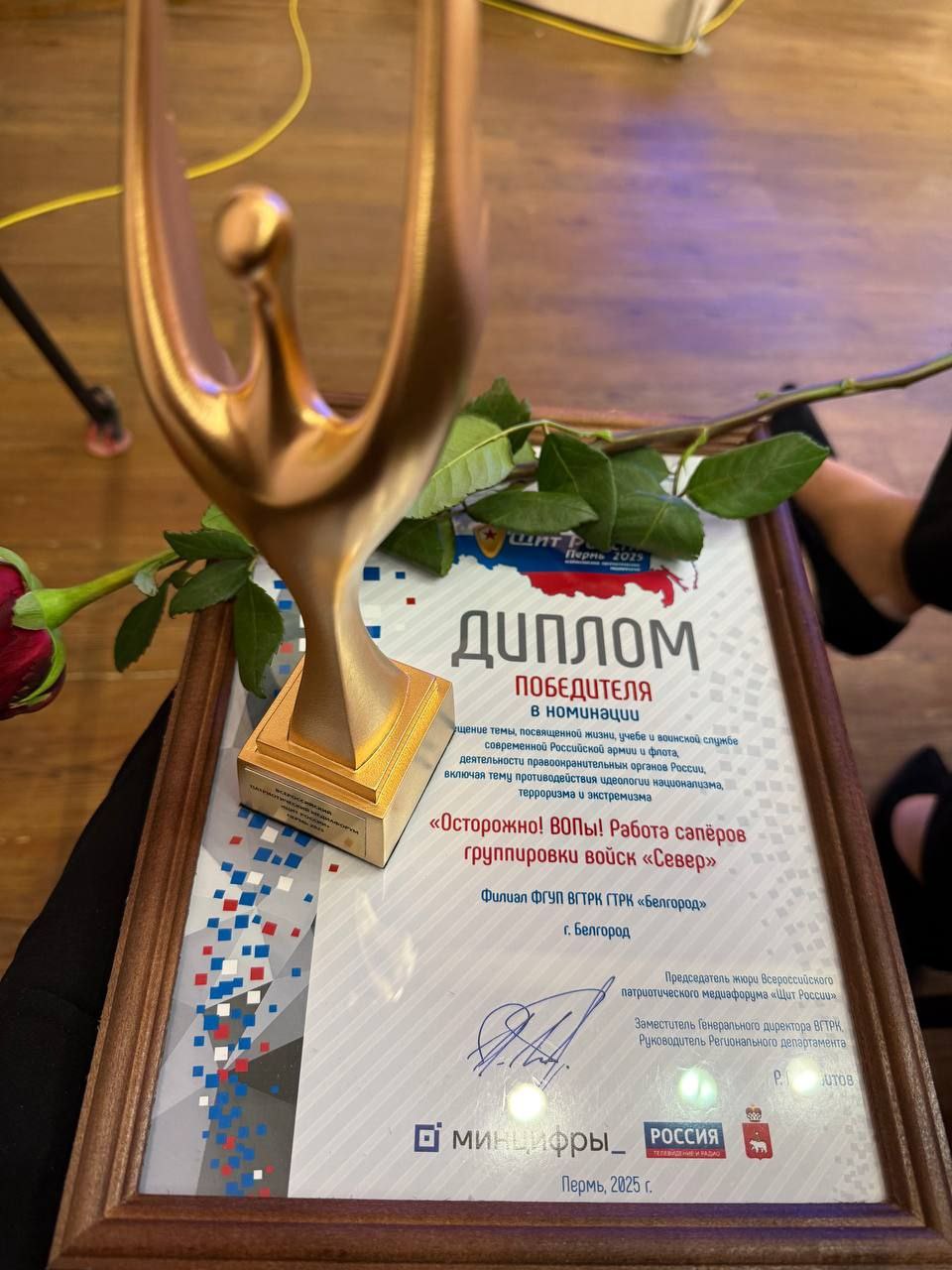 У нашей команды – новая победа! Репортаж ГТРК «Белгород» «Осторожно! ВОПы! Работа сапёров группировки войск «Север» завоевал главный приз – «Нику» – на Всероссийском патриотическом медиафоруме «Щит России». Результаты объявили в Перми буквально час назад.