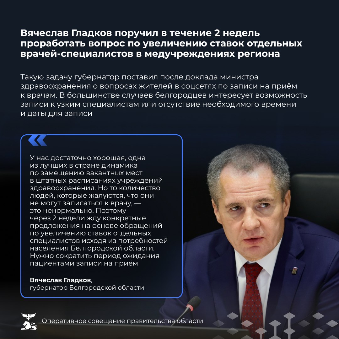 Губернатор Белгородской области поручил уже через 2 недели представить конкретные предложения на основе обращений по увеличению ставок отдельных специалистов исходя из потребностей населения Белгородской области. Власти намерены в короткий срок начать решать эту проблему и сократить период ожидания пациентами записи на приём.