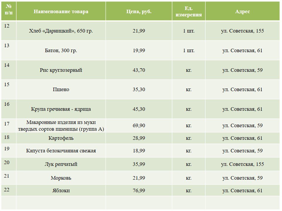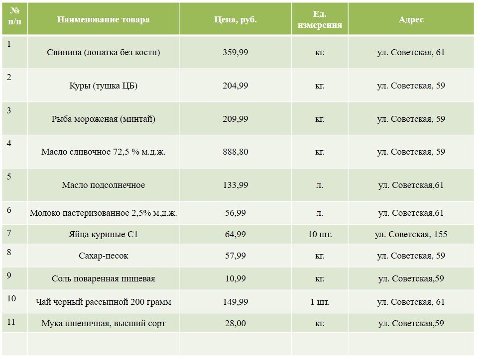 Администрация района регулярно отслеживает цены в местных магазинах, чтобы вы могли делать покупки с максимальной выгодой. В данном обзоре представлена информация о товарах повседневного спроса по самым доступным ценам на территории нашего района.