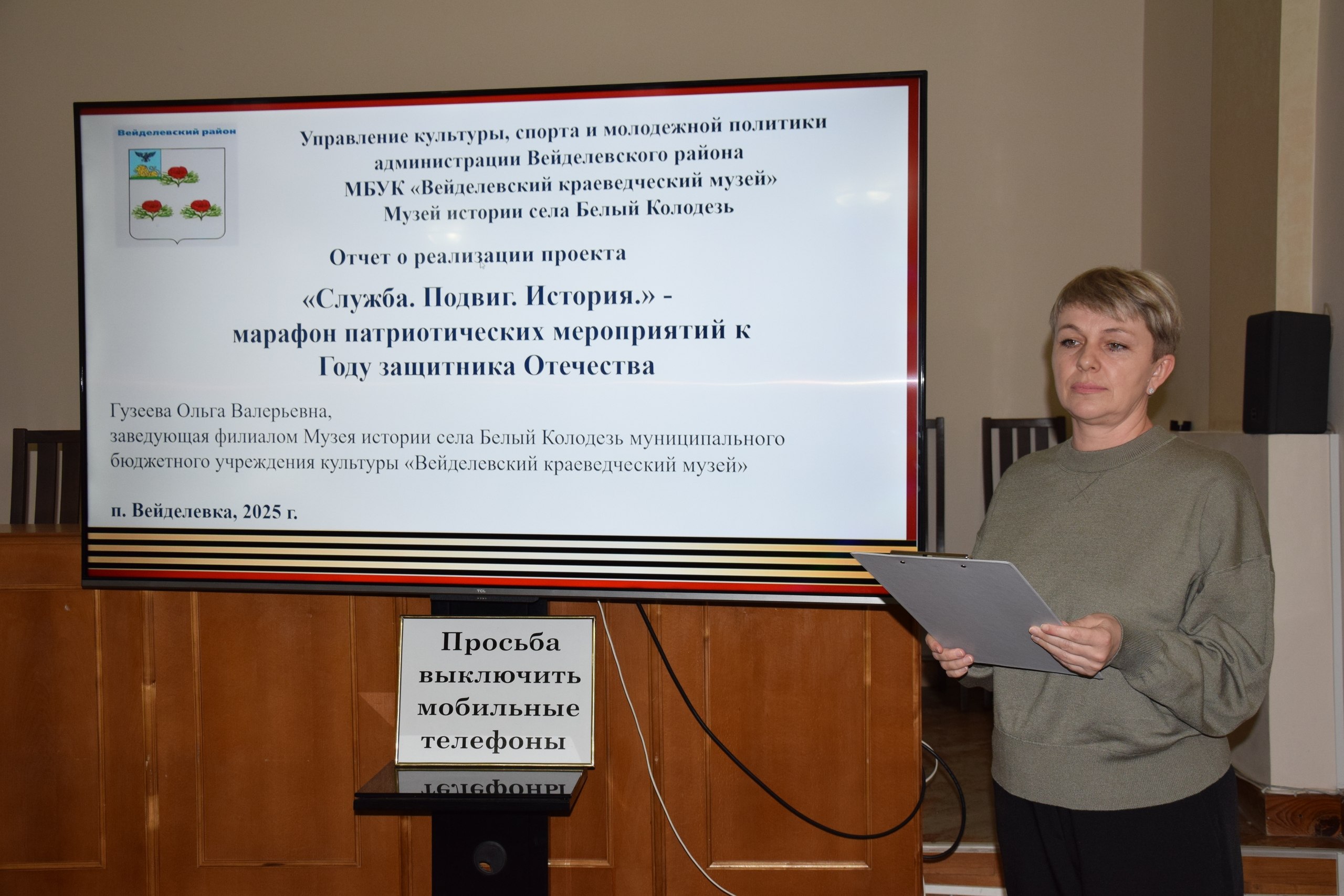 Ольга Валерьевна Гузеева, заведующая филиалом Музея истории села Белый Колодезь, представила отчет о завершении проекта «Служба. Подвиг. История», который включал в себя марафон патриотических мероприятий, посвященных Году защитника Отечества.