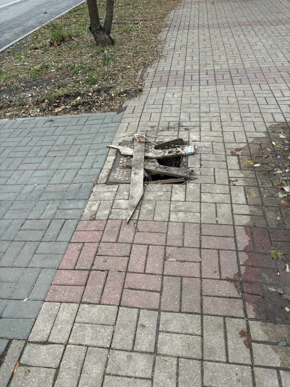 Мужчина утверждает, что крышку повредили около месяца назад. Тогда во время ремонта сквера у Почаевского храма грузовик заехал на тротуар и разбил её. По словам мужчины, с тех пор люк так и не отремонтировали.