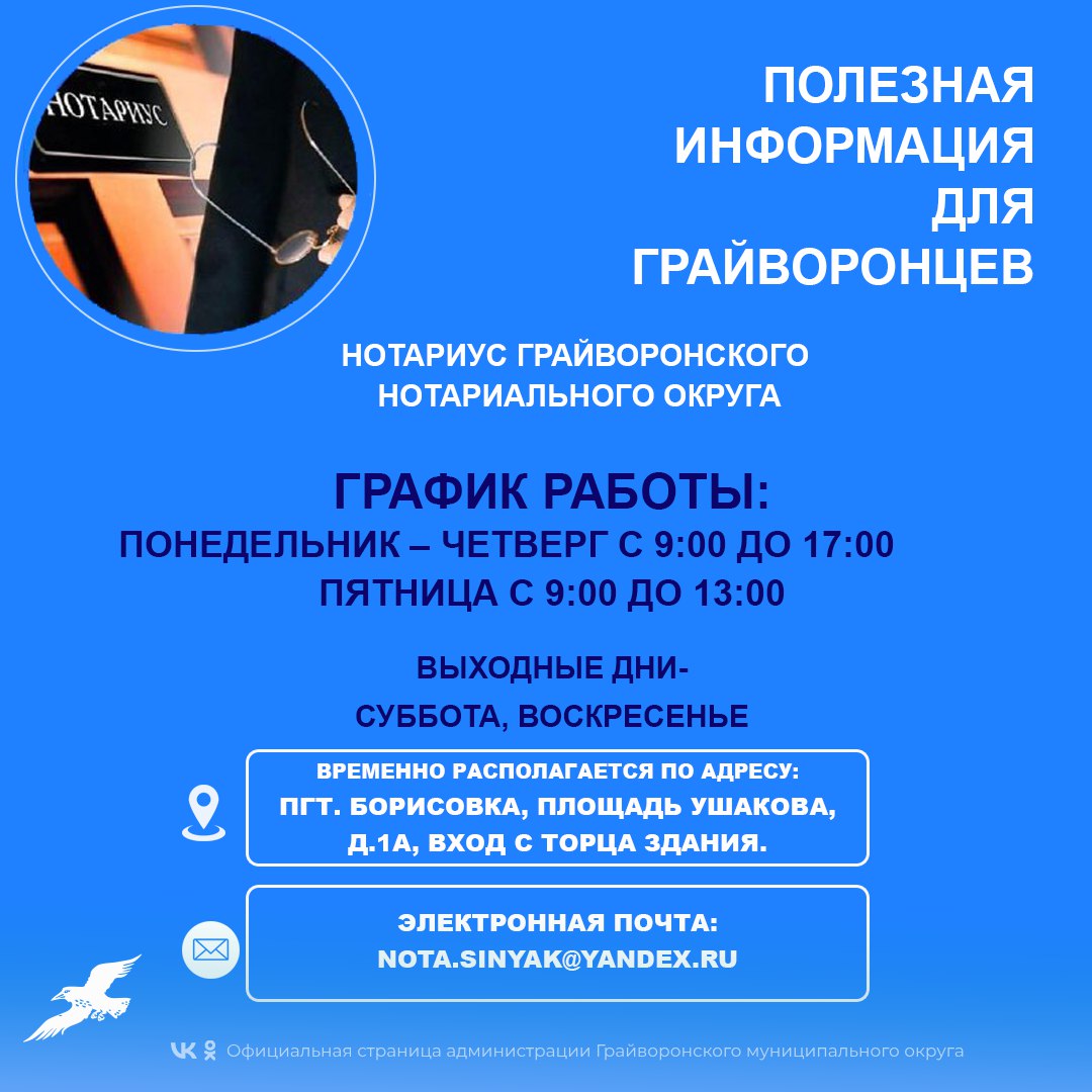 Нотариус Грайворонского нотариального округа Оксана Синяк работает по графику: