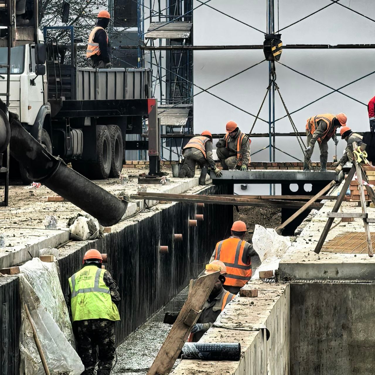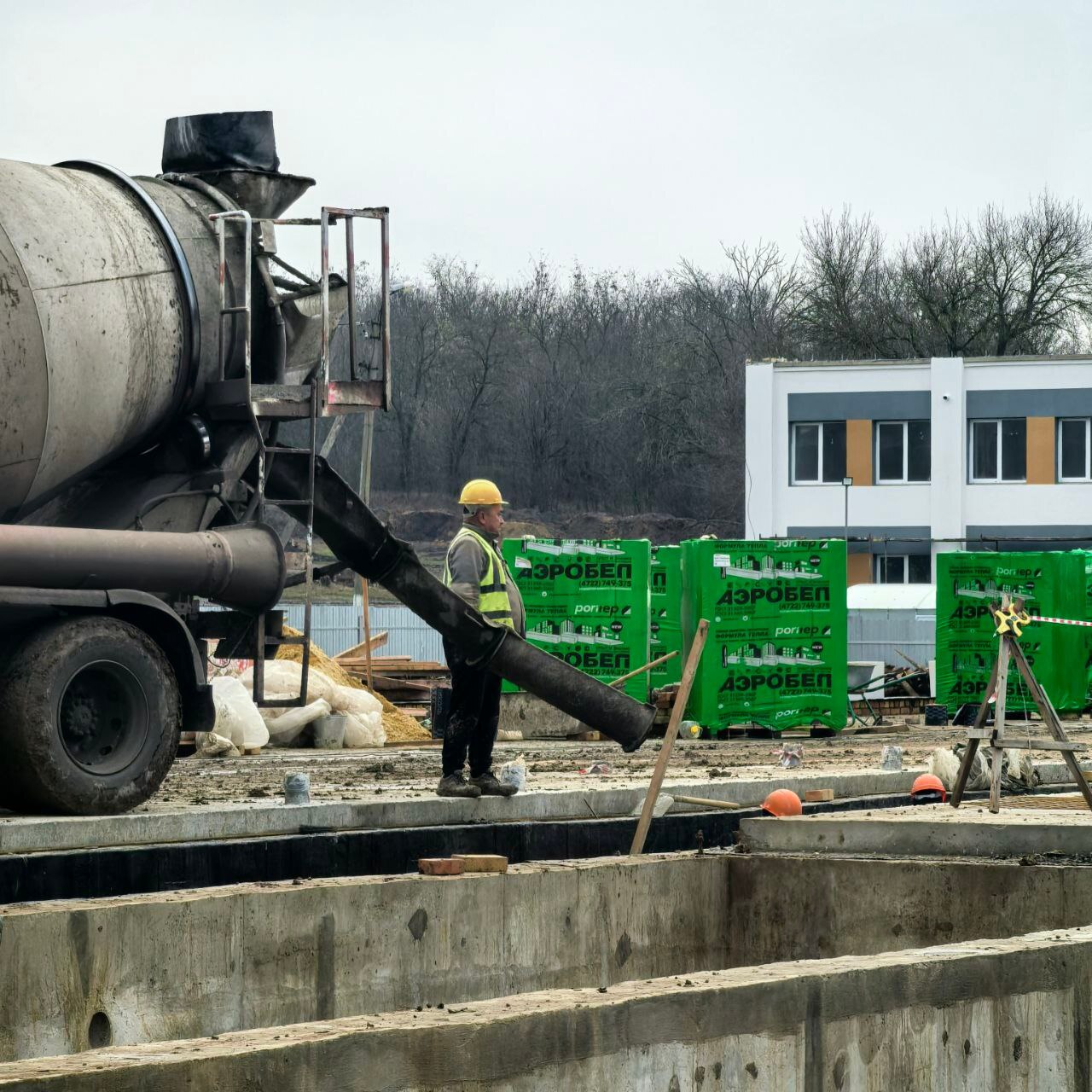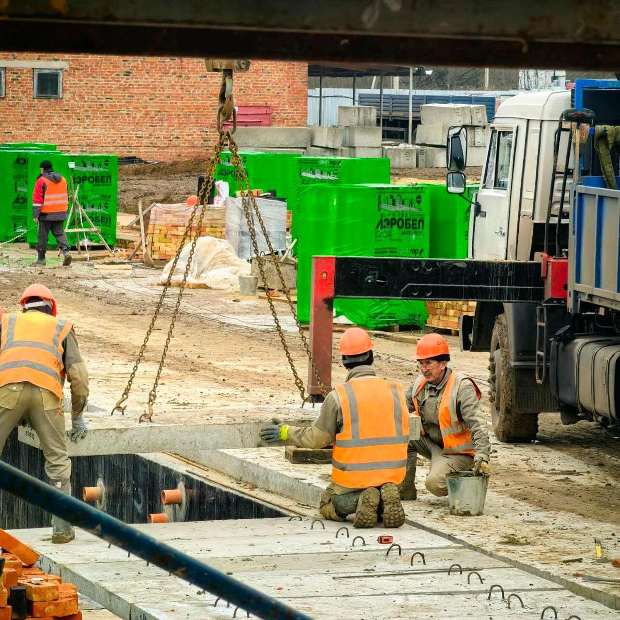 На территории строительной площадки будущего детского сада ведутся активные работы. Подрядчик возводит стены из газосиликатного блока. Одновременно выполняются работы по облицовке стен. Важным этапом является монтаж системы водоотведения. Рабочие проводят обратную засыпку грунтом пазух котлована, что сделает основание детского сада более устойчивым и надежным.