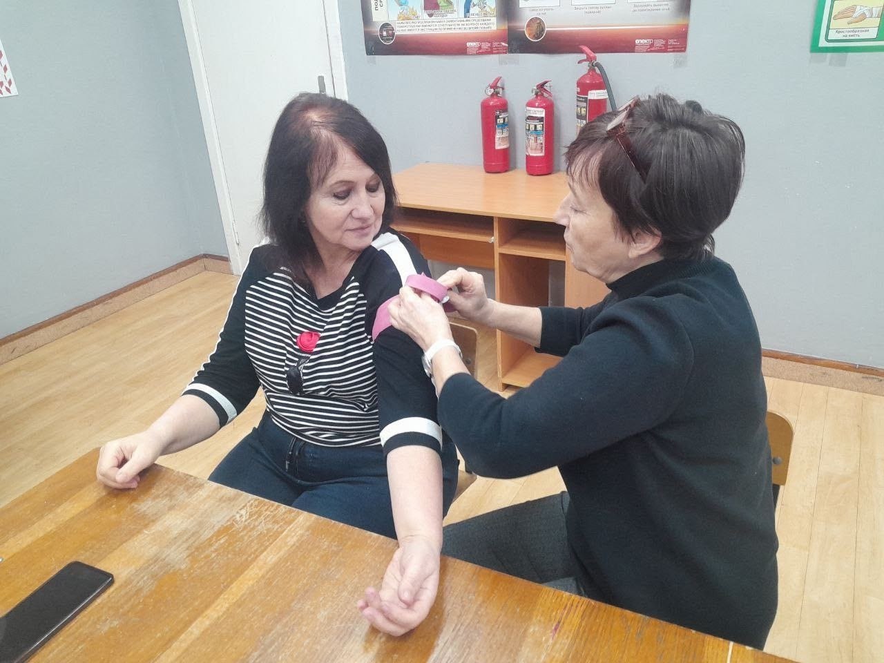 Особое внимание уделили различным видам кровотечений, отработке техник наложения жгута Эсмарха и жгута-турникета, а также применению индивидуальных медицинских перевязочных пакетов. Медицинская сестра Галина Воронина поделилась знаниями о действии и применении спасательного покрывала при переохлаждении и перегреве.