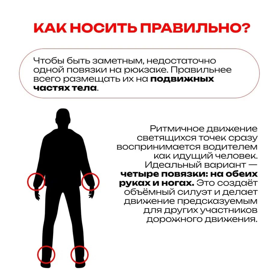 Главный аксессуар для безопасности – световозращающая повязка. Этот маленький кусочек ткани делает человека заметным для водителя за 150-200 метров.