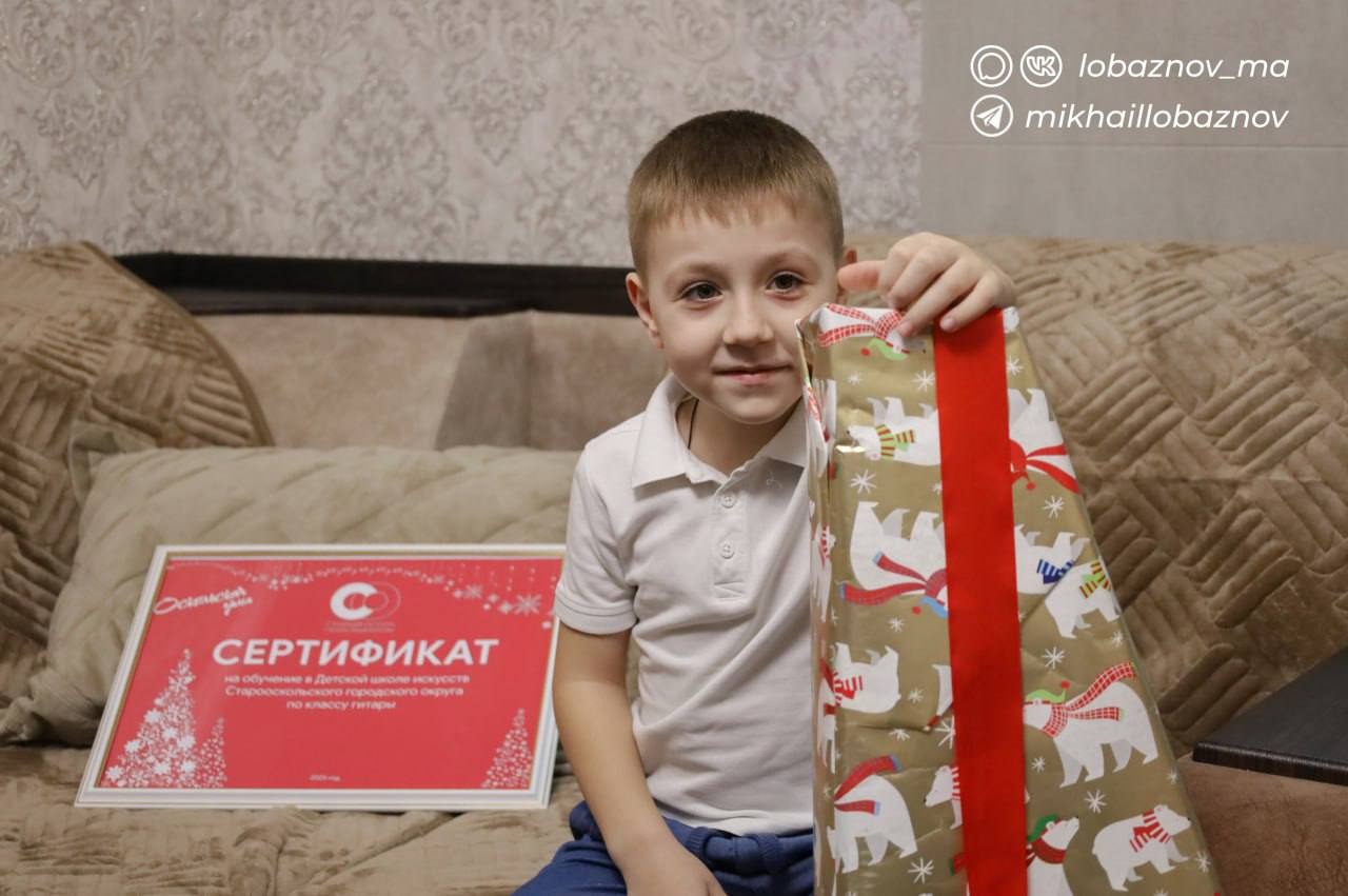На «Ёлке желаний» глава администрации округа Михаил Лобазнов снял шарик с мечтой Кирилла Кургузенкова. Заветным желанием семилетнего мальчика была гитара.