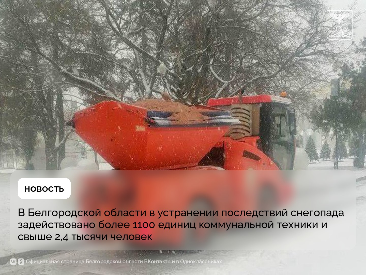 В Белгородской области в устранении последствий снегопада задействовано более 1100 единиц коммунальной техники и свыше 2,4 тысячи человек
