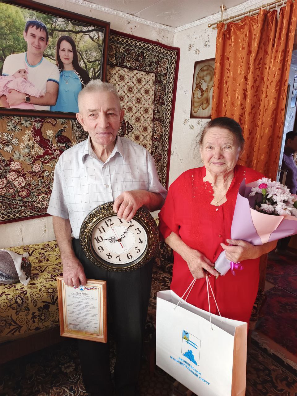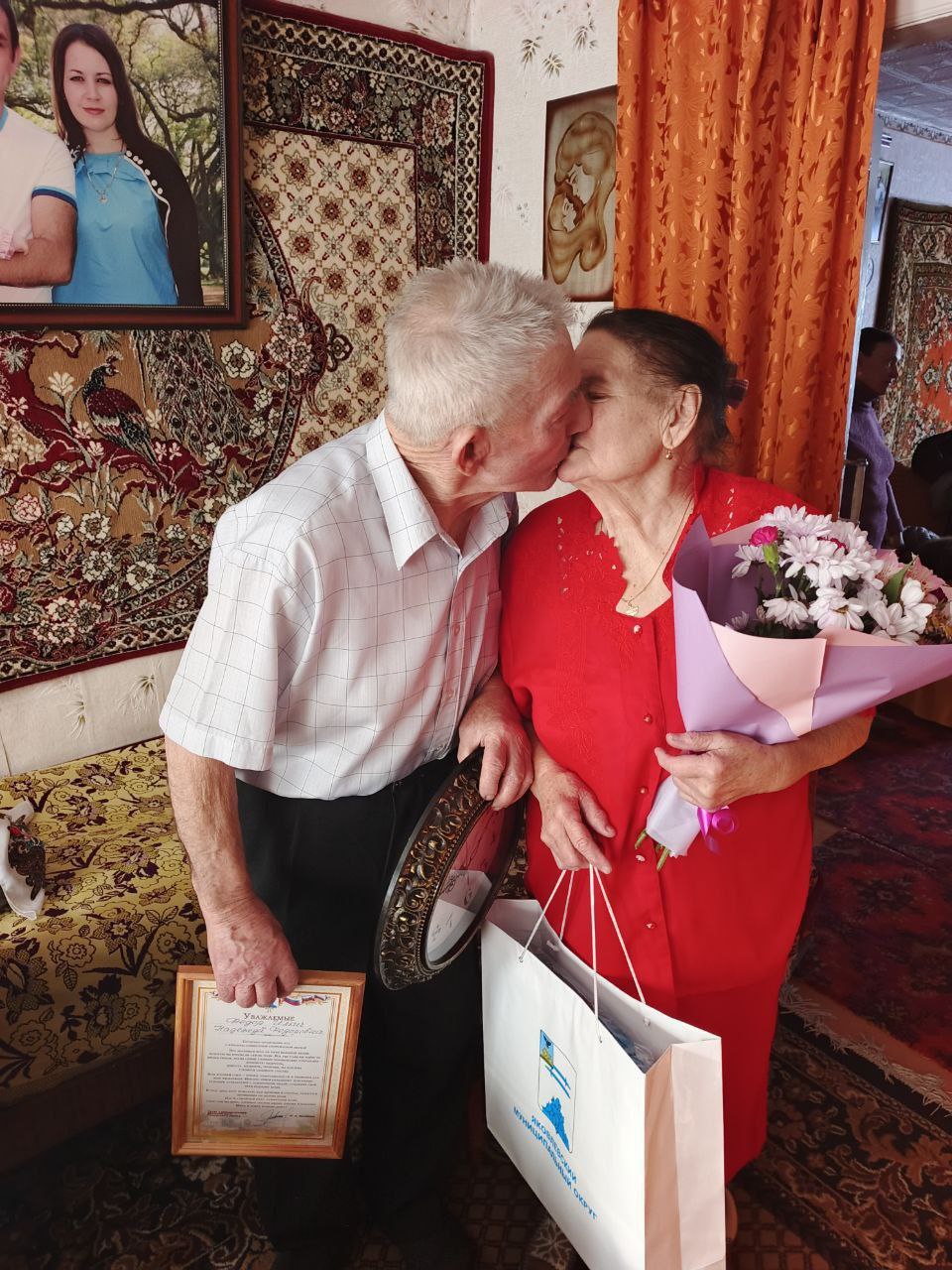 Поздравить юбиляров с этим замечательным событием приехали руководитель управления Алексеевской территории Виктор Владимирович Грищенко и председатель совета ветеранов Тамара Петровна Караулова.