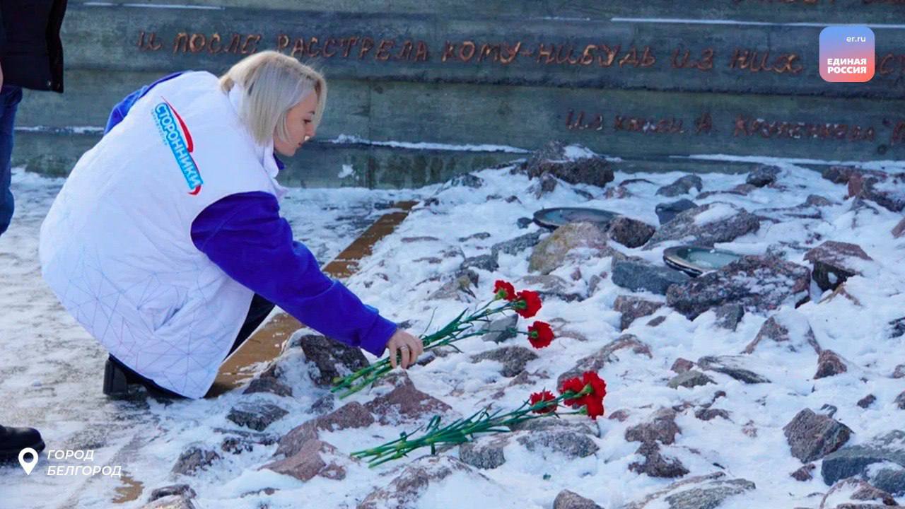 Сегодня в память о жертвах этой ужасной трагедии члены и сторонники Партии возложили цветы к мемориалу жителям города, погибшим от рук фашистов на Камышитовом заводе.