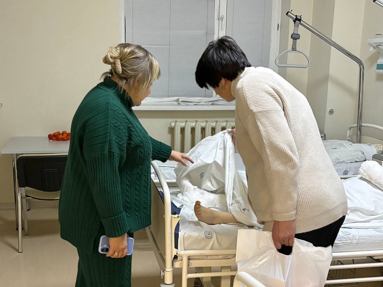 Затем посетила городскую больницу №2, где встретилась с удивительной женщиной, перенёсшей серьёзную баротравму и множественные осколочные ранения рук и ног. Её внутренняя сила произвела на меня глубокое впечатление: несмотря на выпавшие испытания, её лицо было озарено искренней улыбкой. И, что немаловажно, рядом с ней всегда её супруг, оказывающий неоценимую поддержку в этот непростой период.