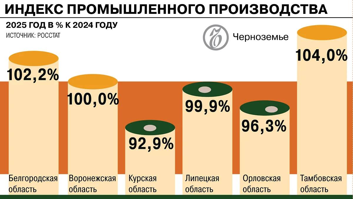 По итогам 2025 года в большинстве областей Черноземья наблюдается промышленный спад, свидетельствуют данные, опубликованные Росстатом. Наибольших масштабов этот процесс достиг в Курской области, где индекс промышленного производства (ИПП, отношение текущего объема производства в денежном выражении к объему в предыдущем году) составил 92,9%. Немногим лучше ситуация в Орловской области, где ИПП равняется 96,3%. Показатель стремится к нулю в Липецкой (99,1%) и достигает его в Воронежской (100%) области. В Белгородской области — незначительное увеличение (102,2%), и лишь в Тамбовской промпроизводство ощутимо выросло (104%). Опрошенные «Ъ-Черноземье» эксперты связывают трудности не только с высокой ключевой ставкой по кредитам, но и со снижением спроса в экономике в целом. При этом, на их взгляд, государство может изменить ситуацию, выстроив новые производственные цепочки в стратегических отраслях.