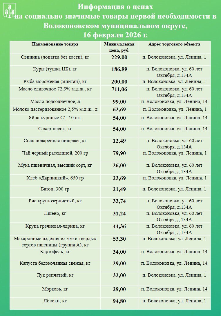 Уважаемые волоконовцы!. Информируем вас о ценах на продовольственные товары из базовой потребительской корзины, складывающихся в нашем муниципалитете на сегодняшний день