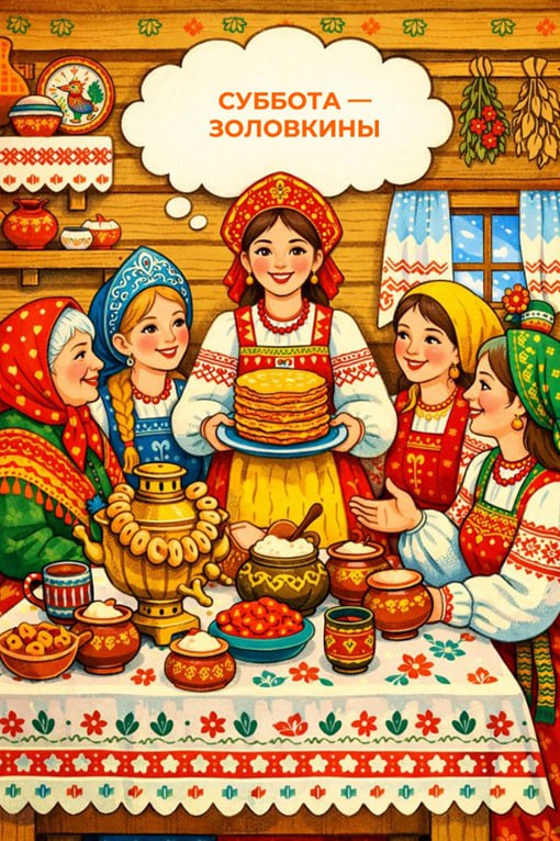 Масленичная суббота посвящена женскому кругу. Молодая жена приглашала в гости сестёр мужа – золовок – вместе с их подругами и семьями.