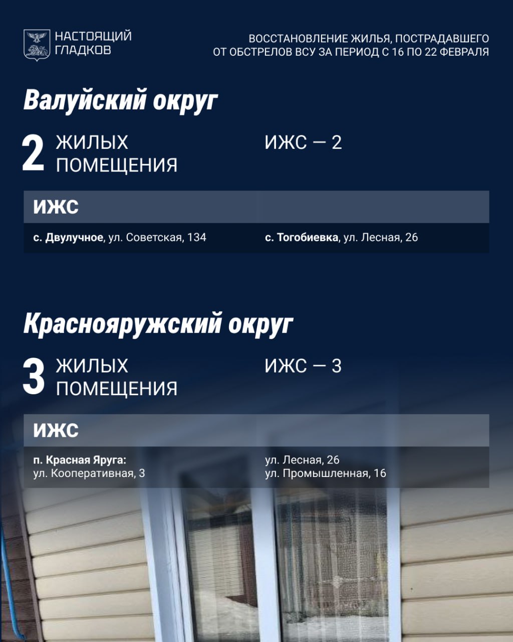 В Валуйском округе закончено 2 дома, повреждено 8 жилых помещений.
