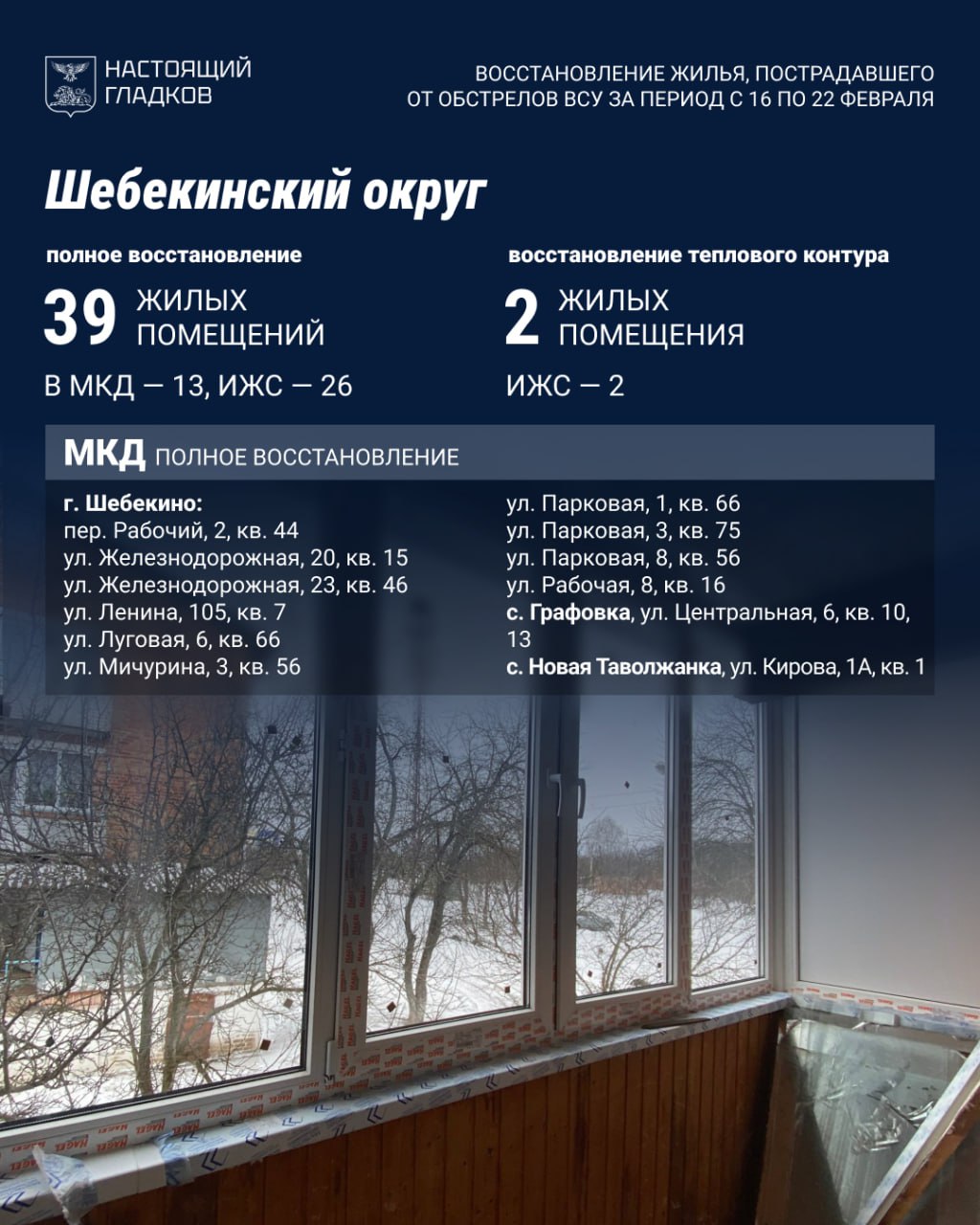 В Белгороде за прошлую неделю восстановлено 55 объектов. За этот же период повреждения выявлены в 181 жилом помещении, а также по 33 автомобилям.