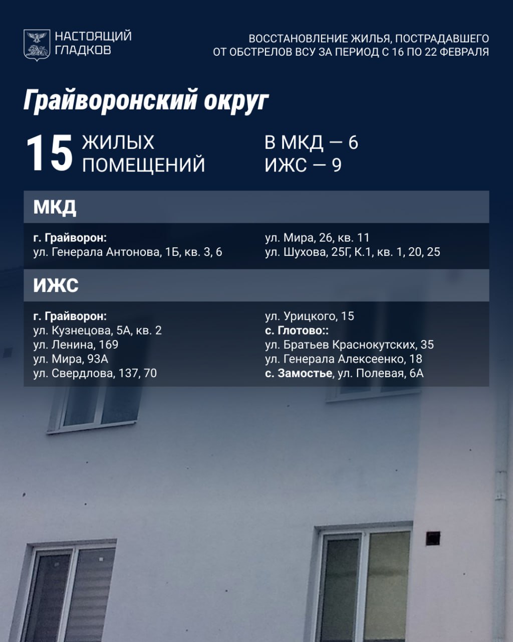 В Грайворонском округе восстановлено 15 домов и квартир. За неделю повреждения зафиксированы по 75 жилым помещениям и 60 машинам. Перечислены компенсации по 25 автомобилям.