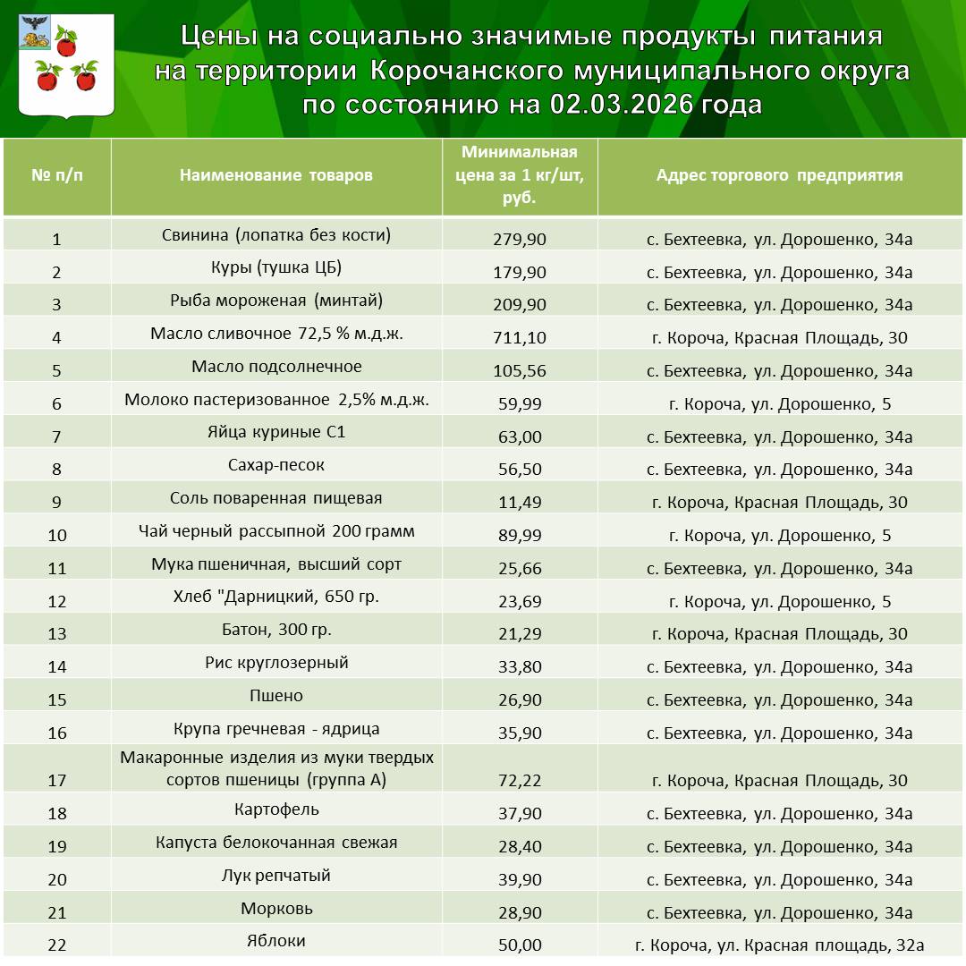 В карточке указаны минимальные розничные цены, зафиксированные на мясо, рыбу, яйца, крупы, молоко, хлеб и овощи, а также адреса торговых предприятий, где их можно приобрести.