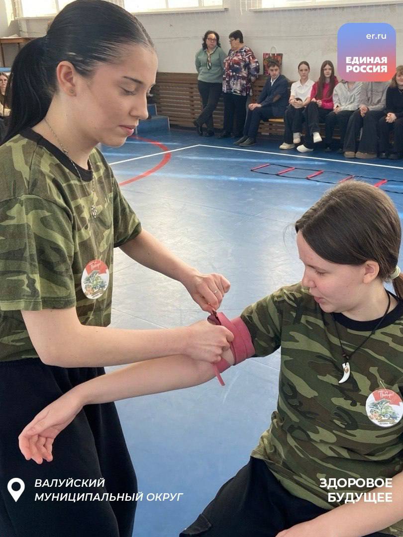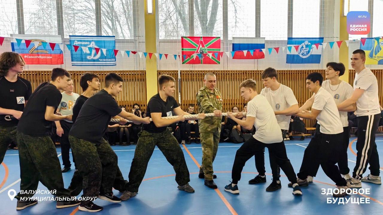В Средней школе №4 валуйские активисты провели военно-спортивную игру «А ну-ка, парни!». Команды преподавательского состава и старшеклассников проверяли скорость разборки и сборки макета автомата АК-47, перетягивали канат, отжимались, показывали знания карт в конкурсе «Топограф» и приняли участие в эстафете с противогазом.