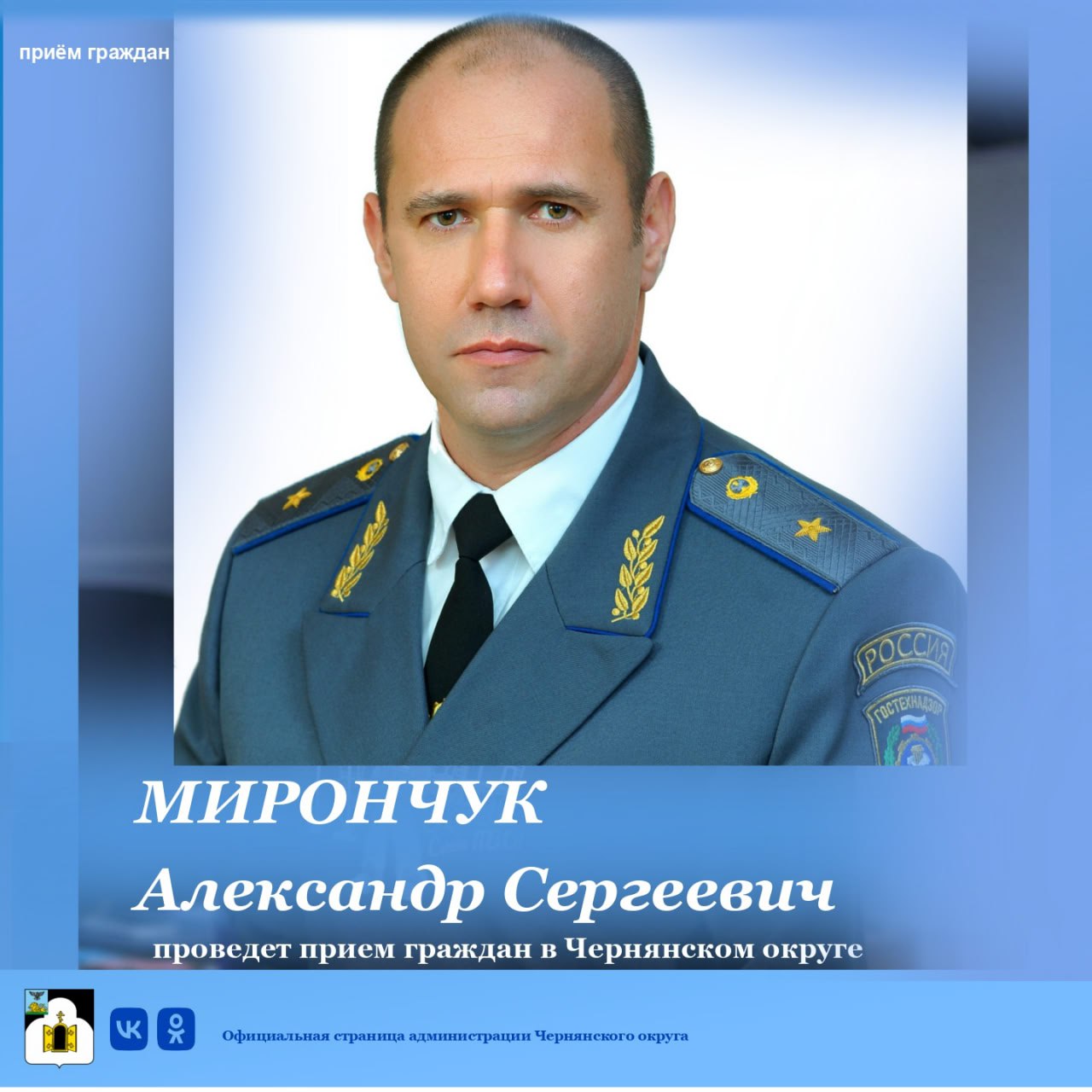 12 марта в 11:00 начальник инспекции Гостехнадзора Белгородской области Мирончук Александр Сергеевич проведёт личный приём граждан.