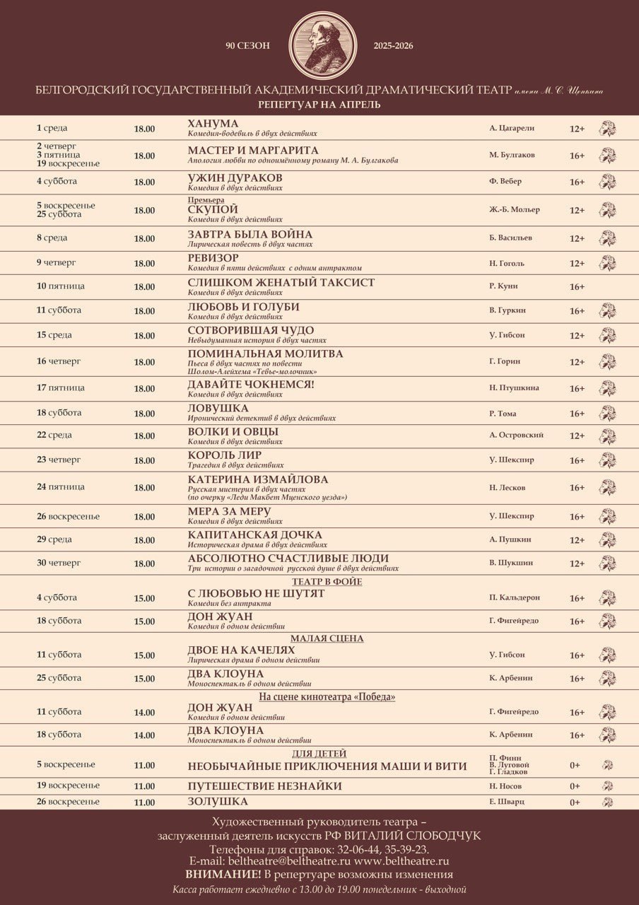Белгородский драмтеатр разместил афишу представлений на апрель