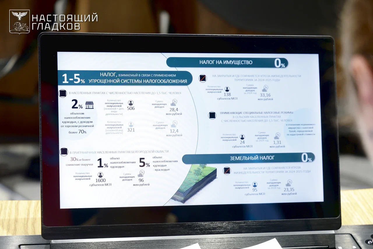 1. Снижение налоговых ставок в части упрощённой системы налогообложения (до 1% — для субъектов, у которых объектом налогообложения являются доходы, и до 5% — для субъектов, объектом налогообложения которых являются «доходы минус расходы») для налогоплательщиков, осуществляющих деятельность в приграничных муниципальных округах, зарегистрированных на данных территориях не позднее 1 января 2026 года, при снижении в отчётных периодах за 2024 и 2025 годы выручки более чем на 30%. Количество потенциальных получателей этой льготы составит порядка 1600 субъектов малого и среднего предпринимательства.