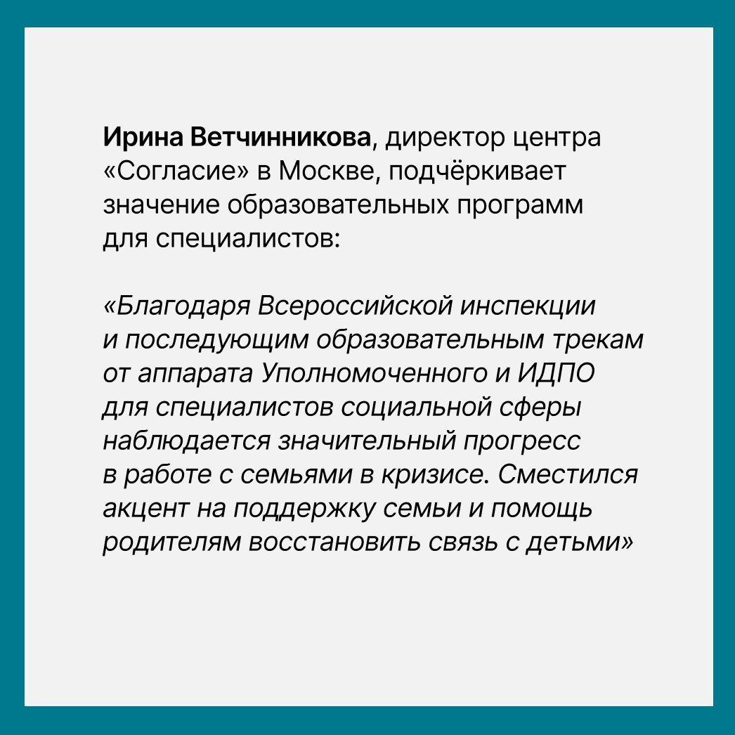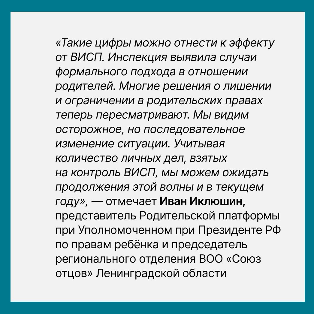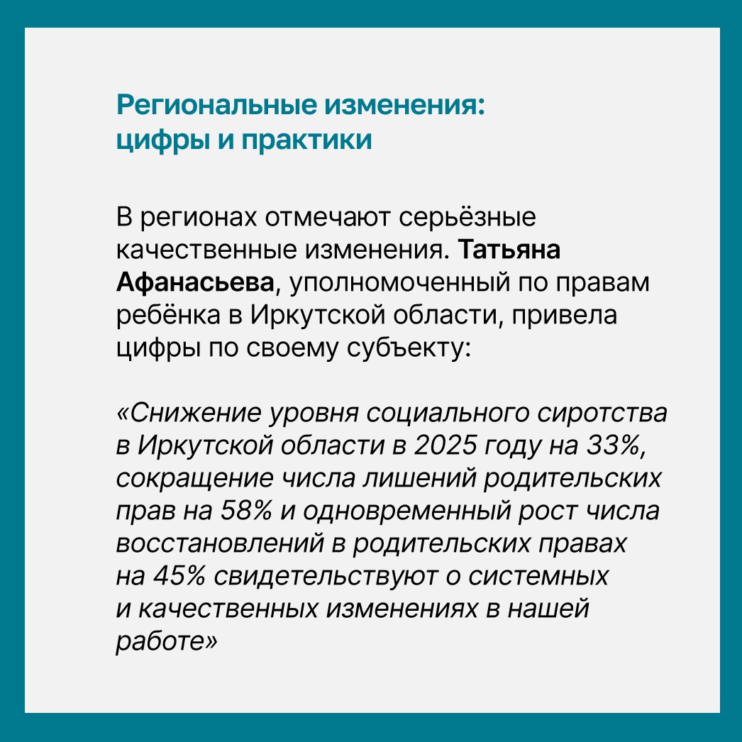 Важную роль в улучшении ситуации сыграла системная работа федеральных органов — Минпросвещения России, федеральных министерств и ведомств, Уполномоченного при Президенте РФ по правам ребёнка Марии Львовой-Беловой. На это обратила внимание Лариса Фальковская, директор Департамента государственной политики в сфере защиты прав детей Минпросвещения России.