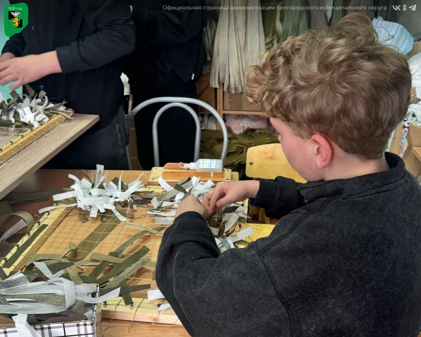 С гордостью и большой ответственностью ребята с энтузиазмом учатся изготавливать защитные маскировочные сети для наших героев.